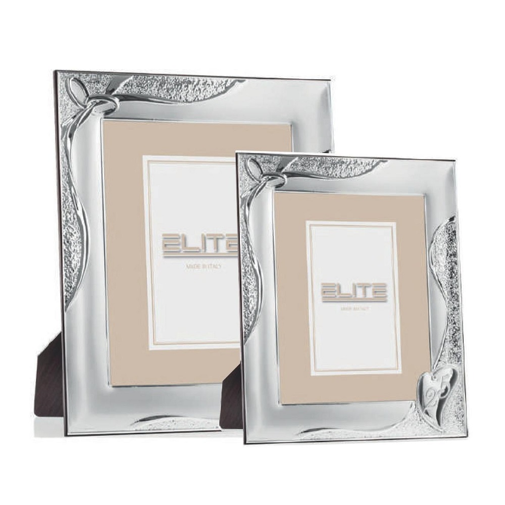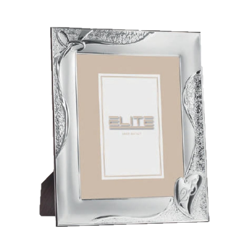 Portafoto in argento satinato con lavorazione martellata, simboli fedi e 25° in cuore, per fotografia verticale. Retro in legno. Made in Italy