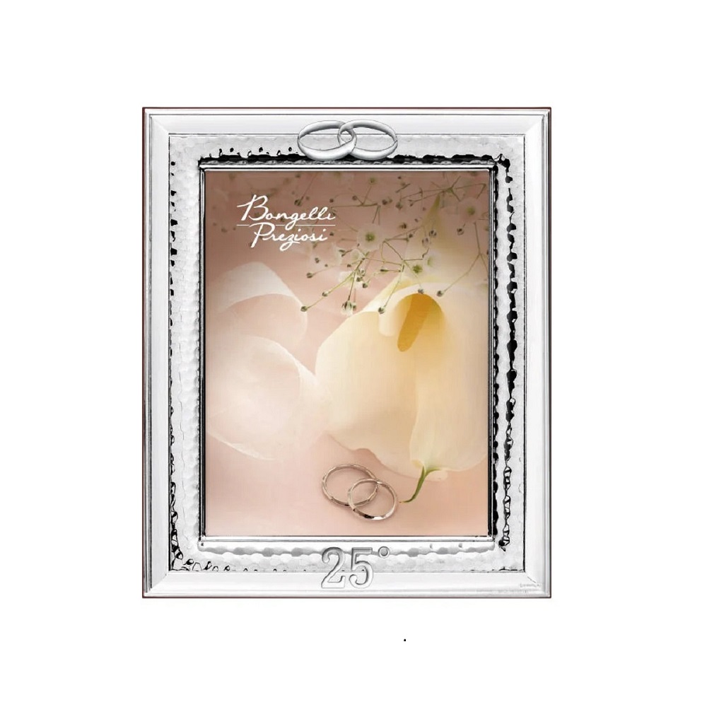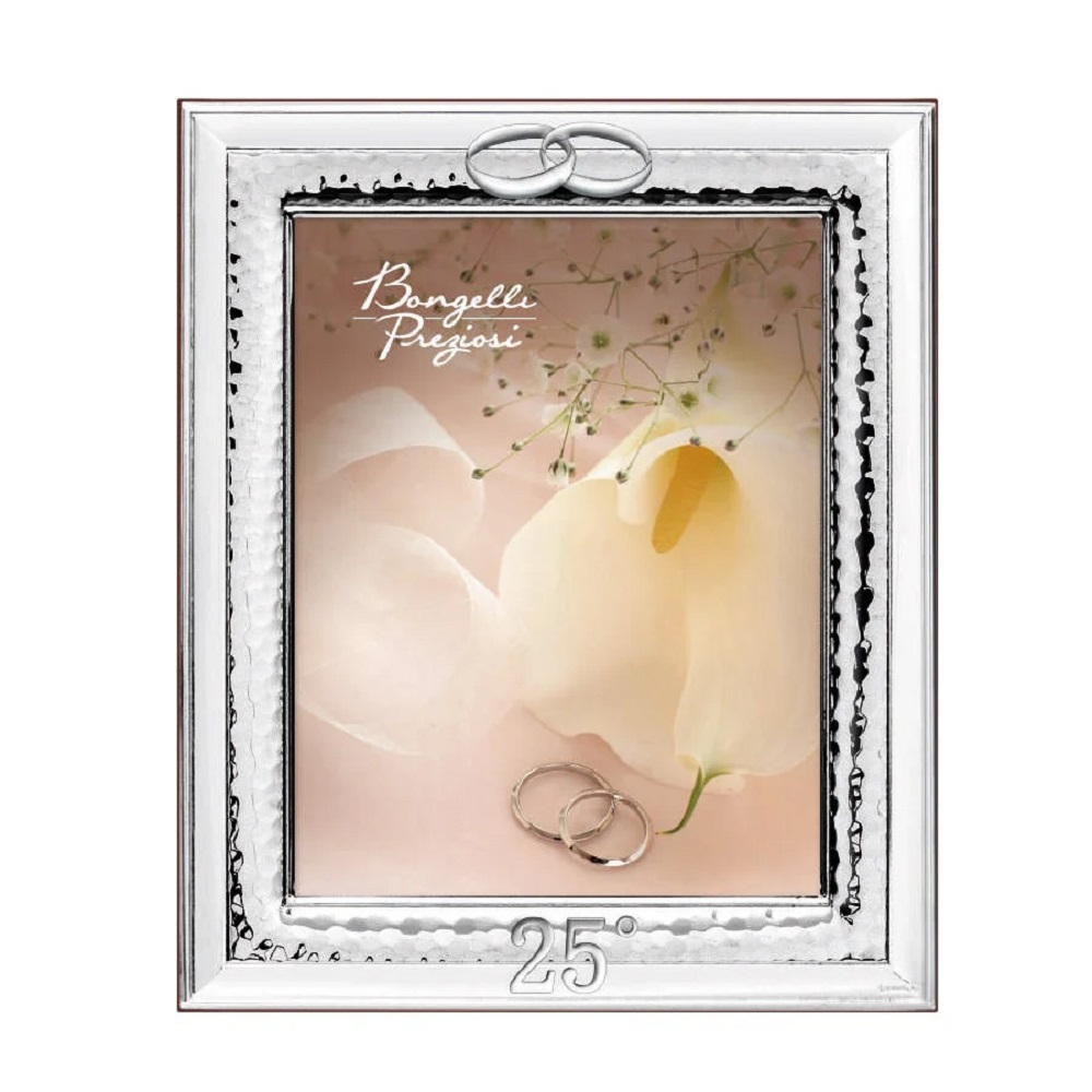 Portafoto in argento con lavorazione martellata e simboli fedi e 25°, per fotografia verticale. Retro in legno