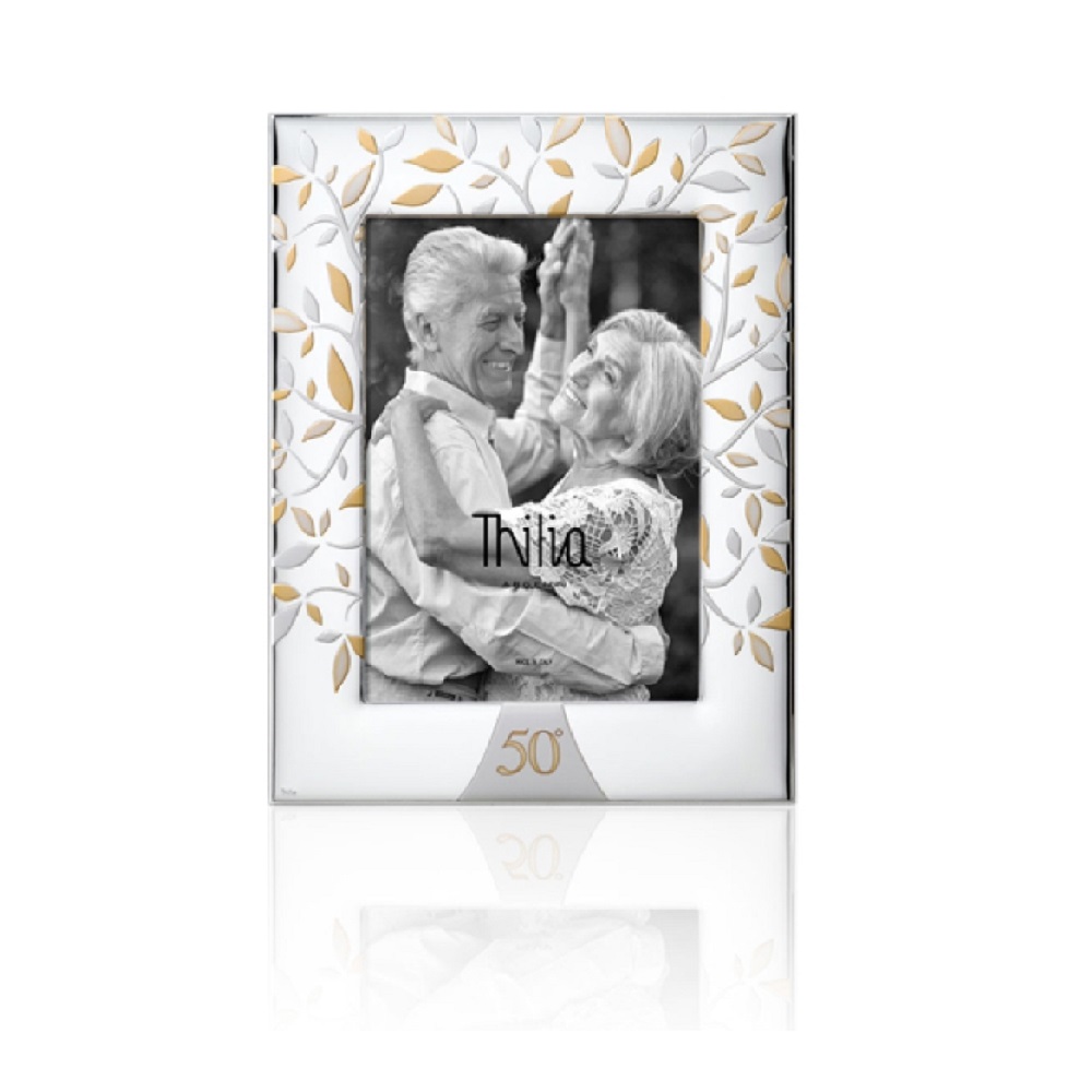 Portafoto rivestito in argento con dettagli dorati, decoro albero della vita e 50° per fotografia verticale. Retro in legno. Made in Italy
