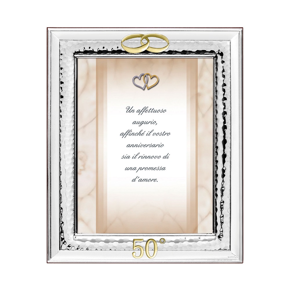 Portafoto in argento con lavorazione martellata e simboli fedi e 50°, per fotografia 18 x 24 cm verticale. Retro in legno