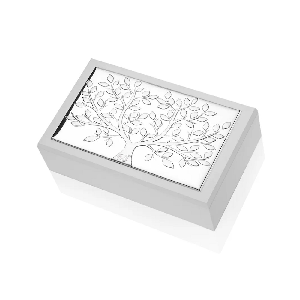 Cofanetto in legno con blasone in argento con decoro albero della vita e 60°. Made in Italy