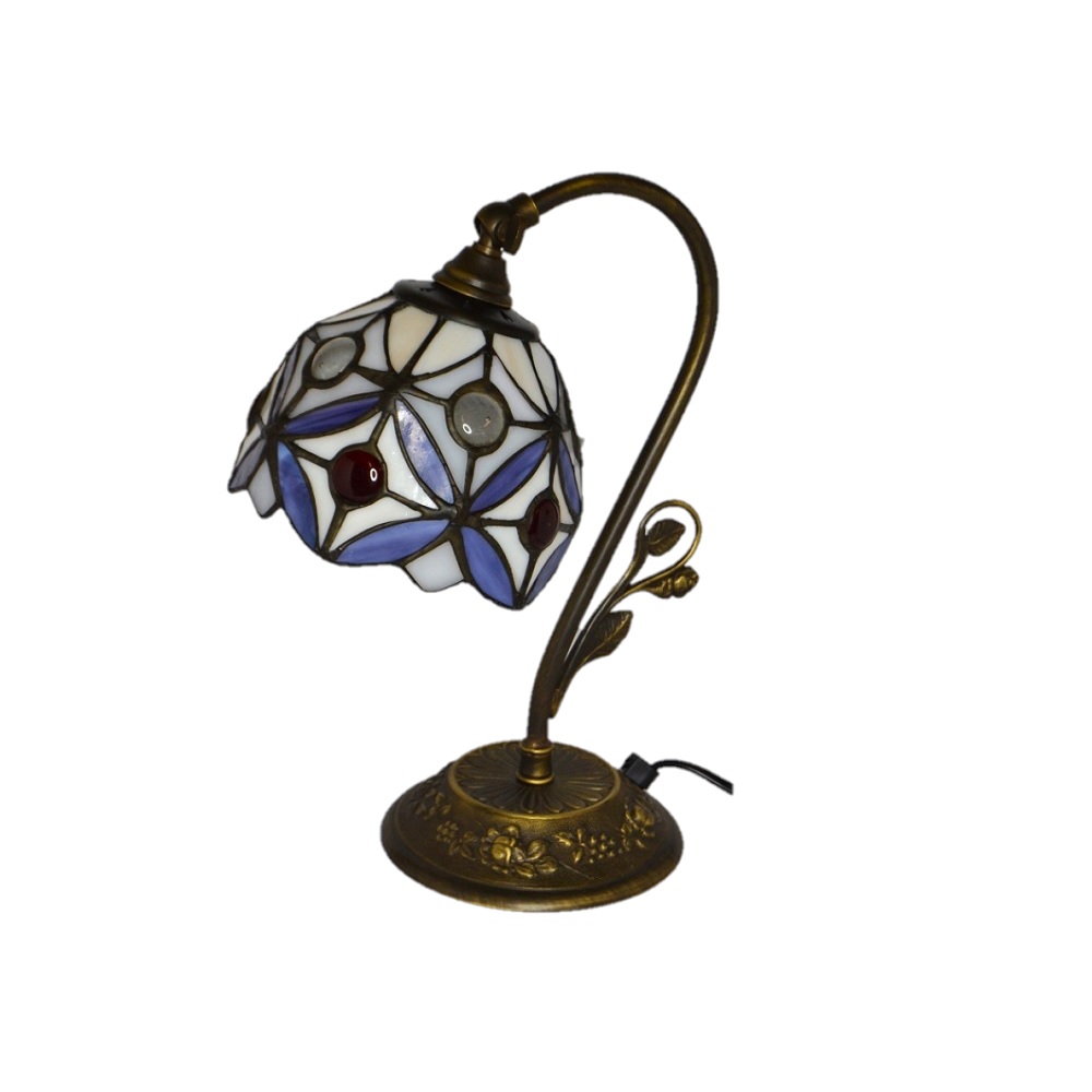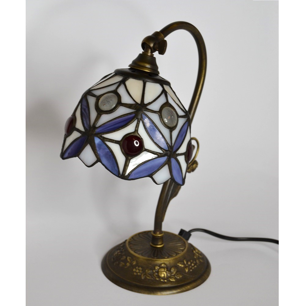Lampada abat jour con base in bronzo con decoro floreale e cappello con lavorazione a piombo Tiffany bianco, viola e amaranto