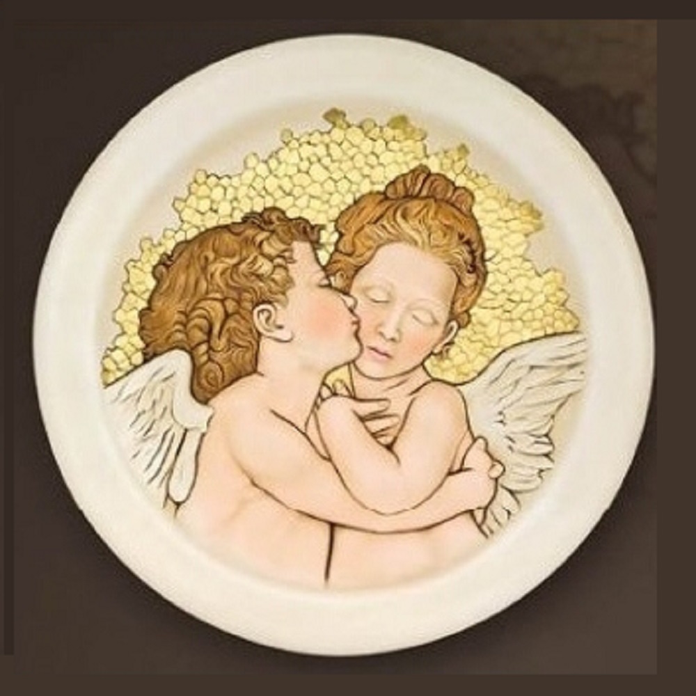 Icona tonda con angeli decorata a mano con colori e vernici atossiche. Da appendere