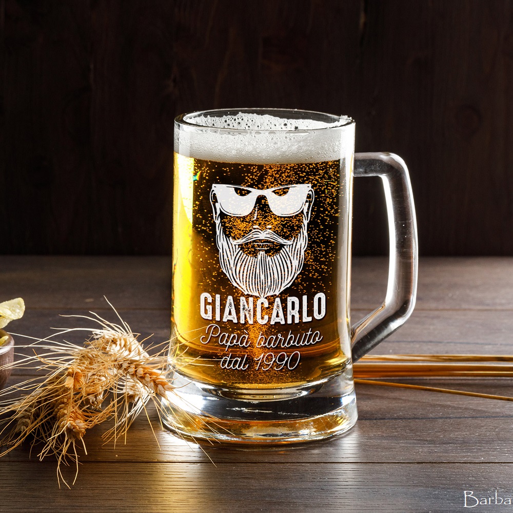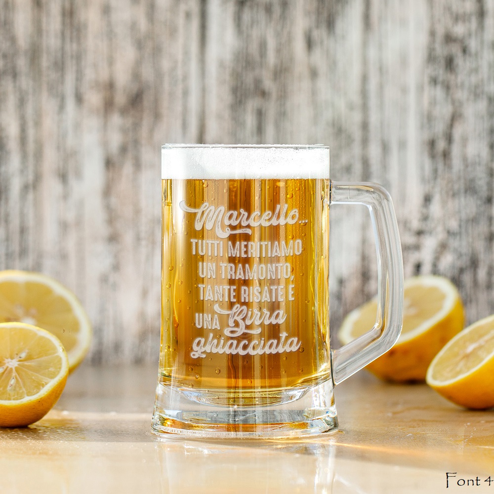 Boccale per birra in vetro trasparente con incisione a laser personalizzata. Qualsiasi lettera e parola può essere sostituita, seleziona il modello in base alla grafica che preferisci e dai libero sfogo alla tua fantasia per creare il regalo perfetto!