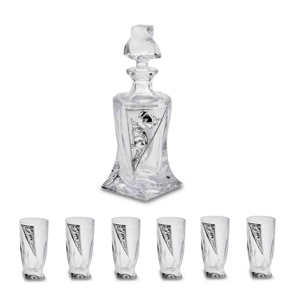 Set composto da bottiglia con 6 bicchieri per vodka in vetro trasparente con blasone in argento decoro papaveri