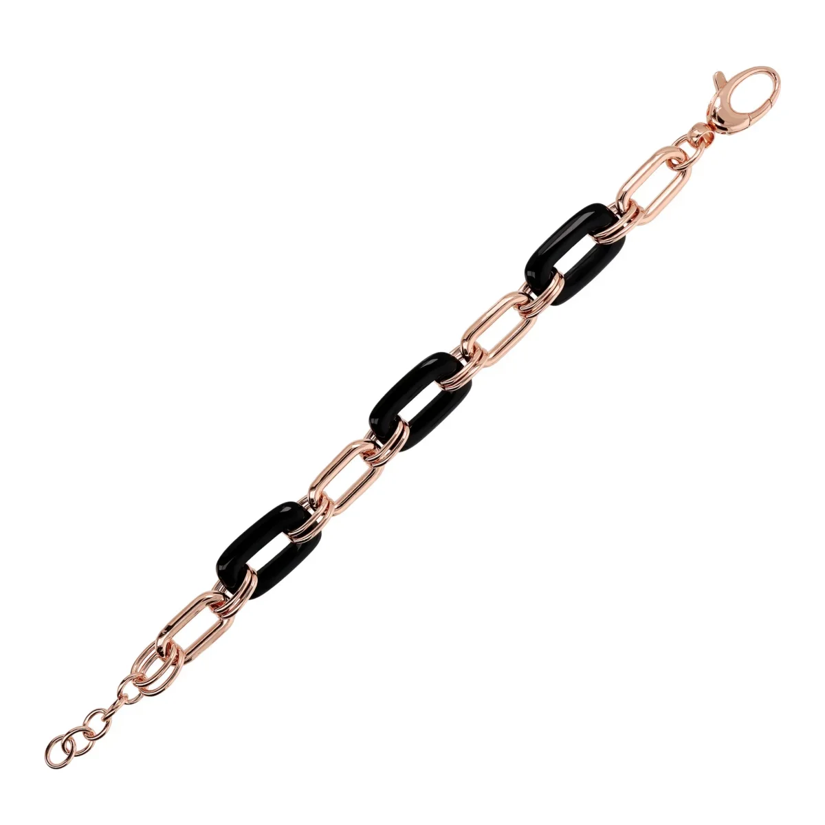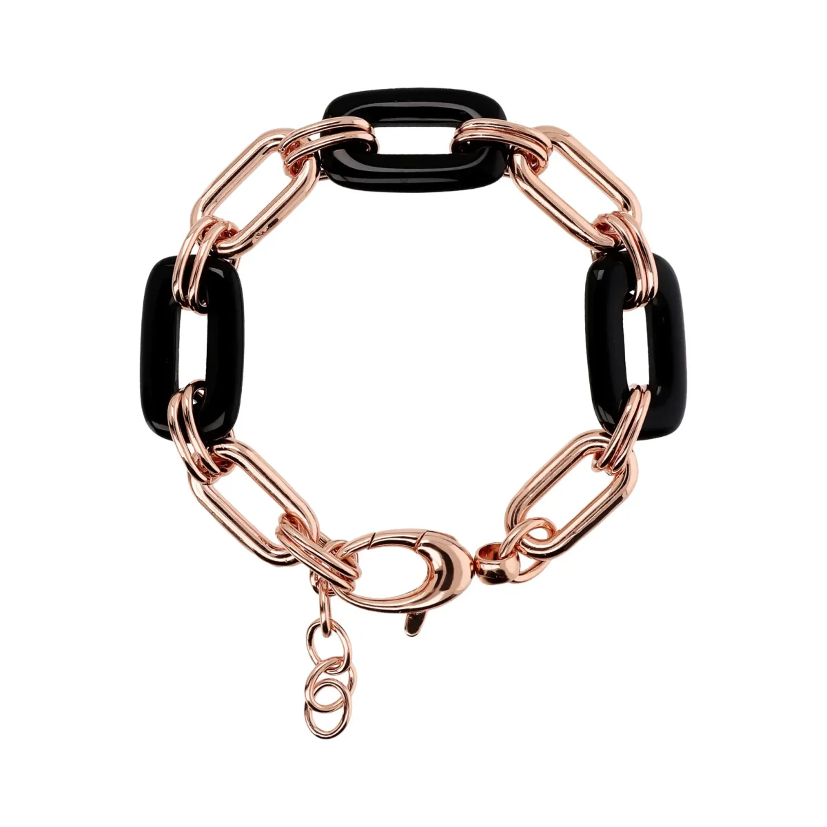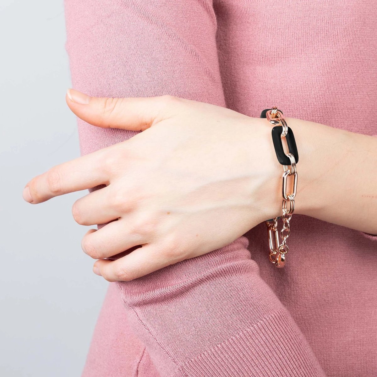 Bracciale realizzato in lega Golden Rosé, placcato oro rosa 18kt, con maglia ovale alternata a maglie rettangolari (14×24 mm) in pietra naturale; chiusura a moschettone ed extender.