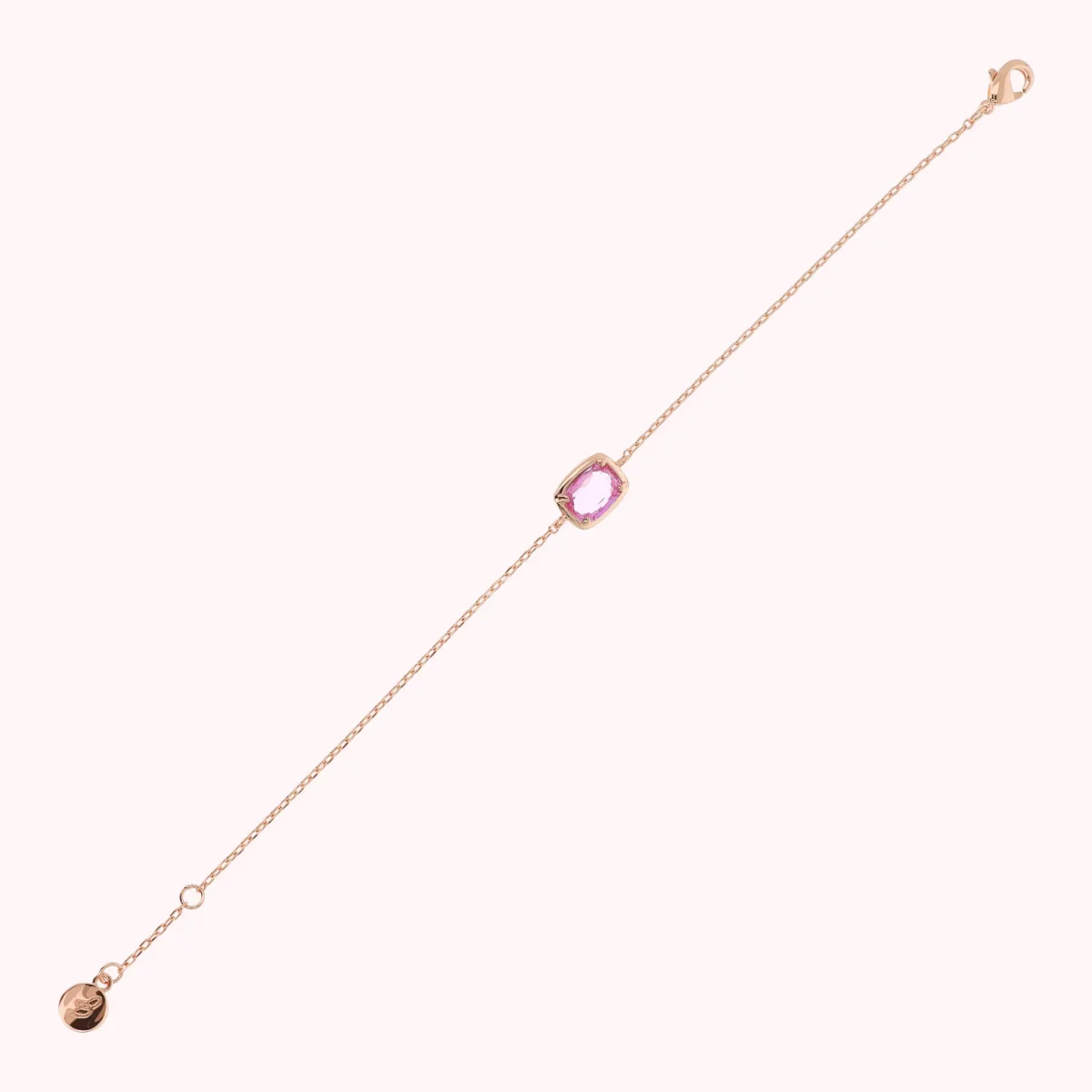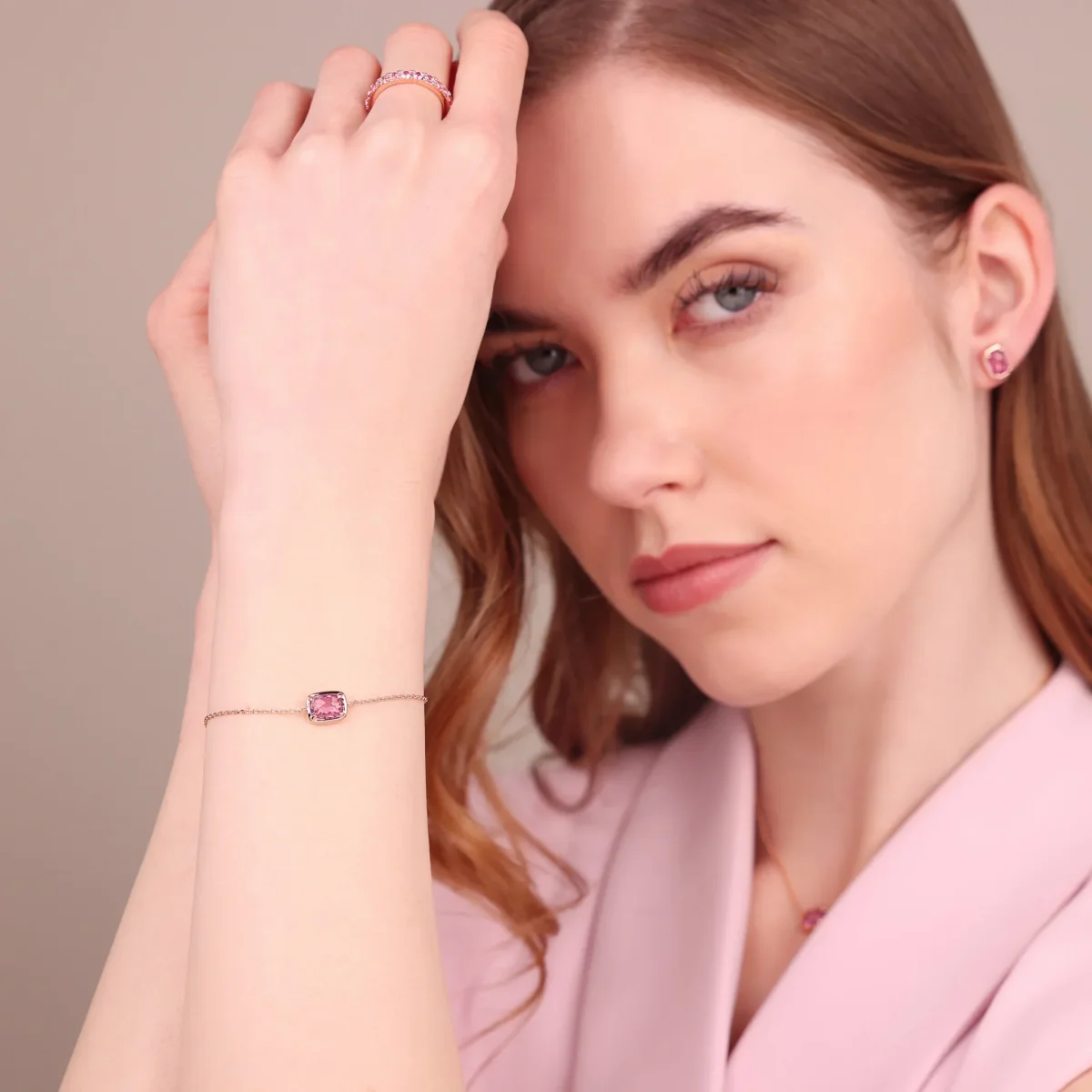 Bracciale Bronzallure realizzato in lega Golden Rosé, placcata Oro rosa 18kt, con catena forzatina impreziosita da una pietra prisma gem centrale a baguette (11×8 mm). Lunghezza 17cm con anellino interposto a 16cm. Chiusura a moschettone.