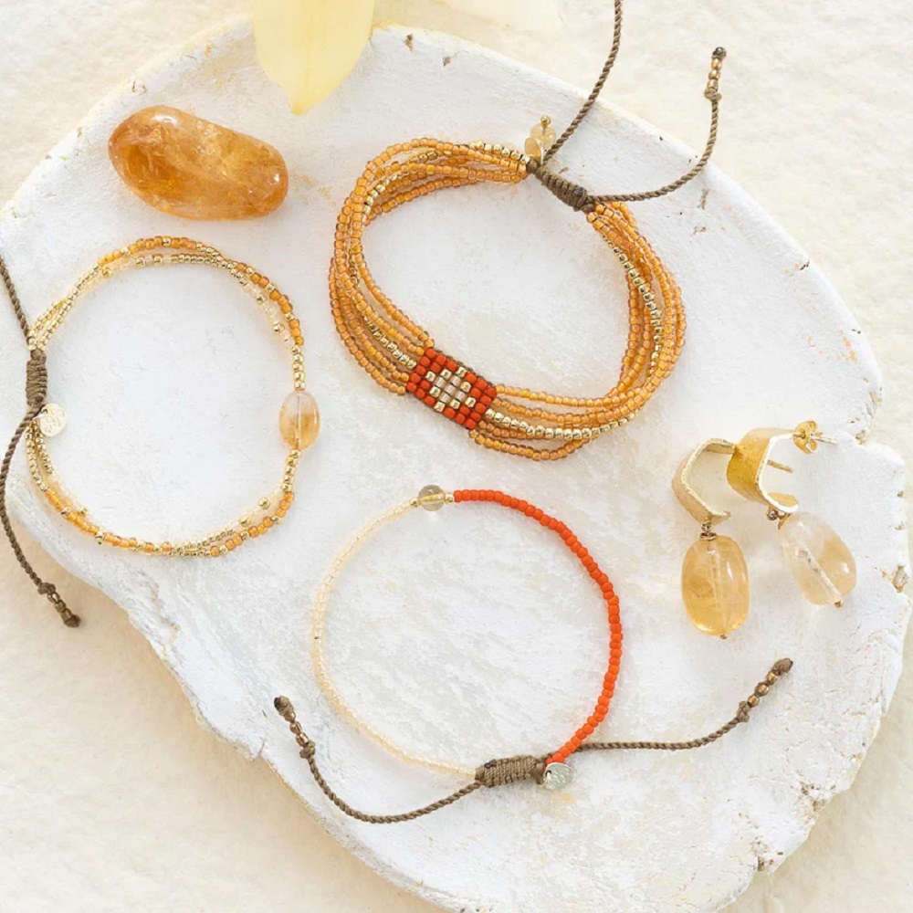 Bracciale composto di due fili in cotone con perle di vetro giallo, arancio e color oro, perline di ottone e gemma di quarzo citrino.