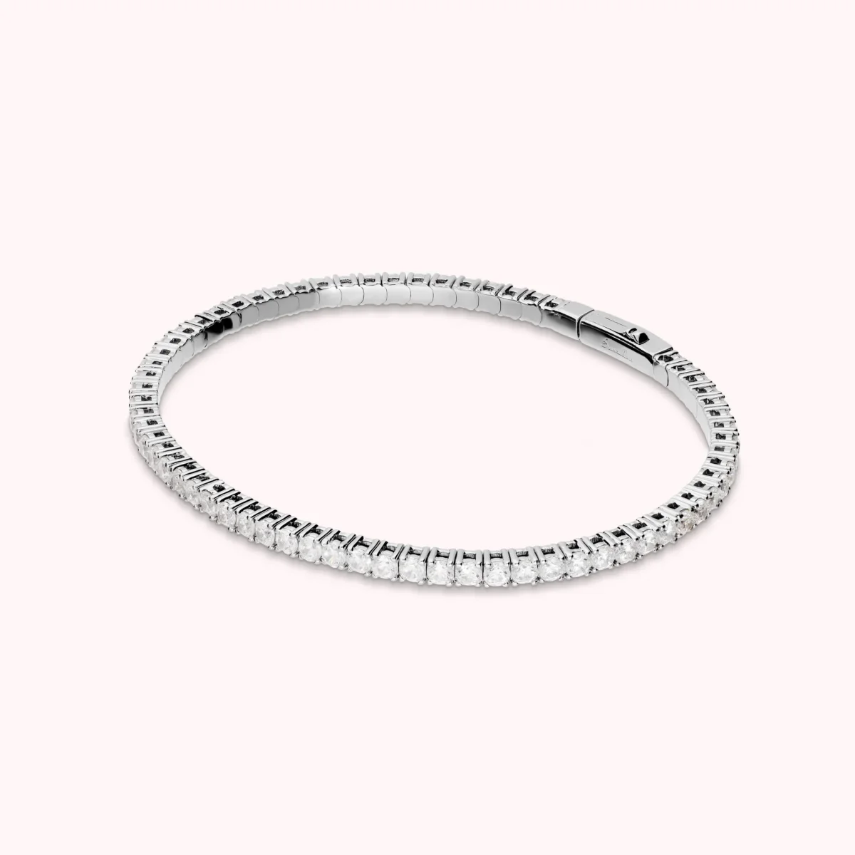 Bracciale tennis ‘Memory’ Bronzallure realizzato in lega Golden Rosé, placcata Rodio, impreziosito da cubic zirconia bianche (2.5 mm), qualità luminosa. Chiusura a cassetto. Diametro interno 60×50 mm.