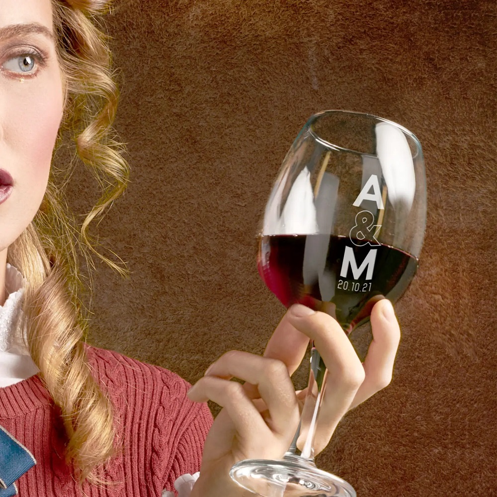 Calice per vino in vetro trasparente con incisione a laser personalizzata. Qualsiasi lettera e parola può essere sostituita, seleziona il modello in base alla grafica che preferisci e dai libero sfogo alla tua fantasia per creare il regalo perfetto!