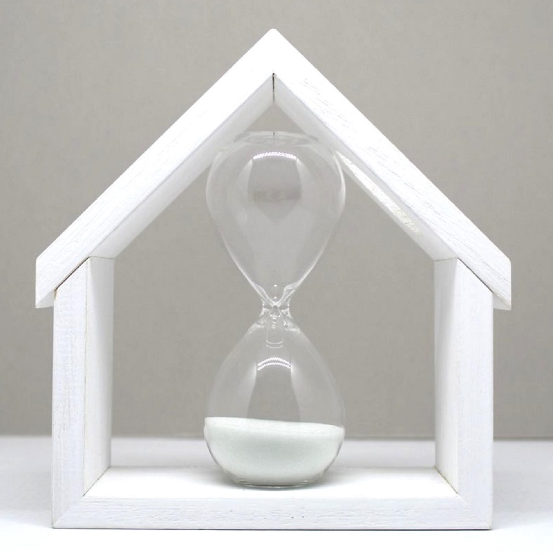 Clessidre con sabbia colorata (piccola: bianca, azzurra e rosa. Grande: bianca, azzurra, rosa, argento e oro) in casette in legno bianco.