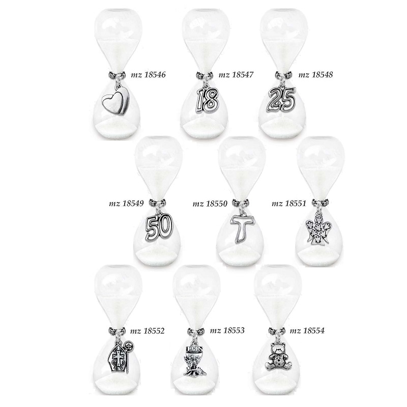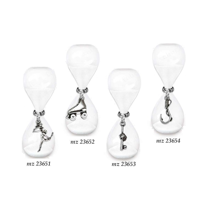 Clessidre in vetro con sabbia bianca e ciondoli in argento.