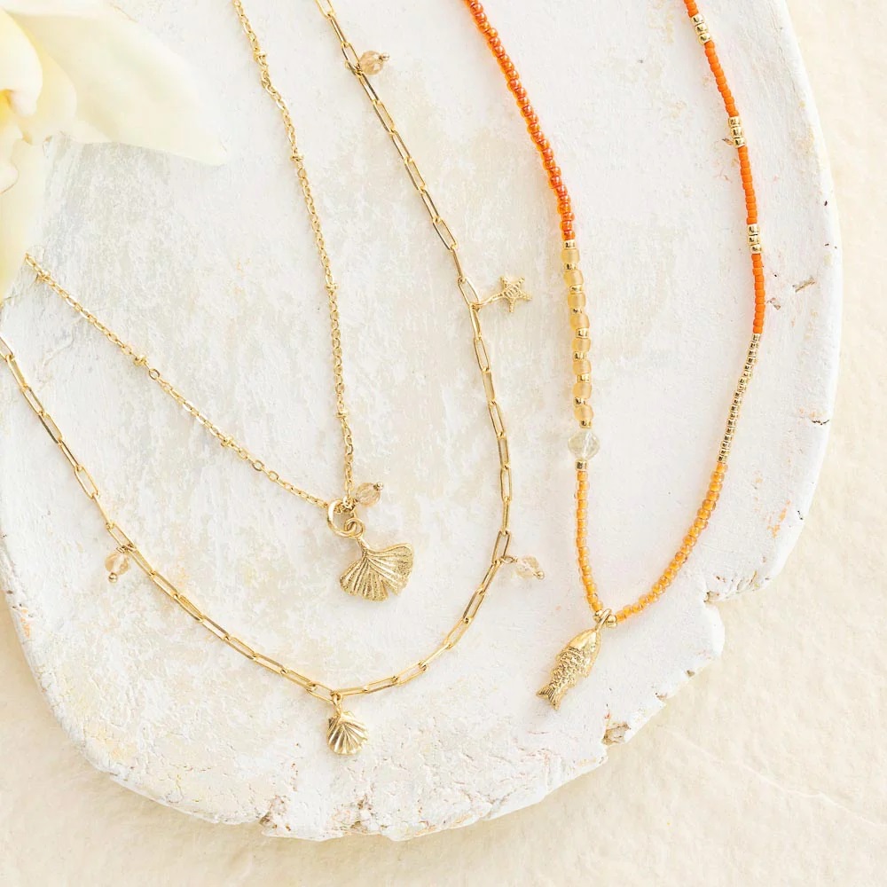 Collana con perle di vetro gialle e arancio, perline di ottone placcate in oro, piccola gemma di quarzo citrino e ciondolo pesce placcato in oro.