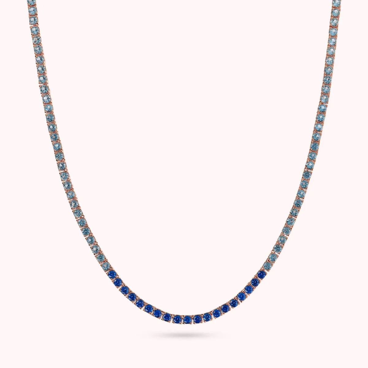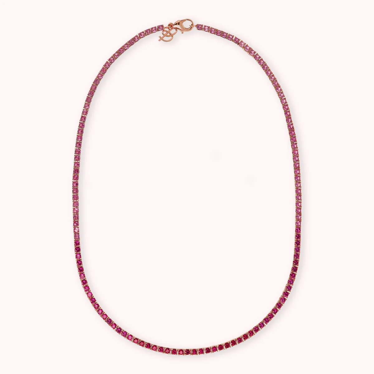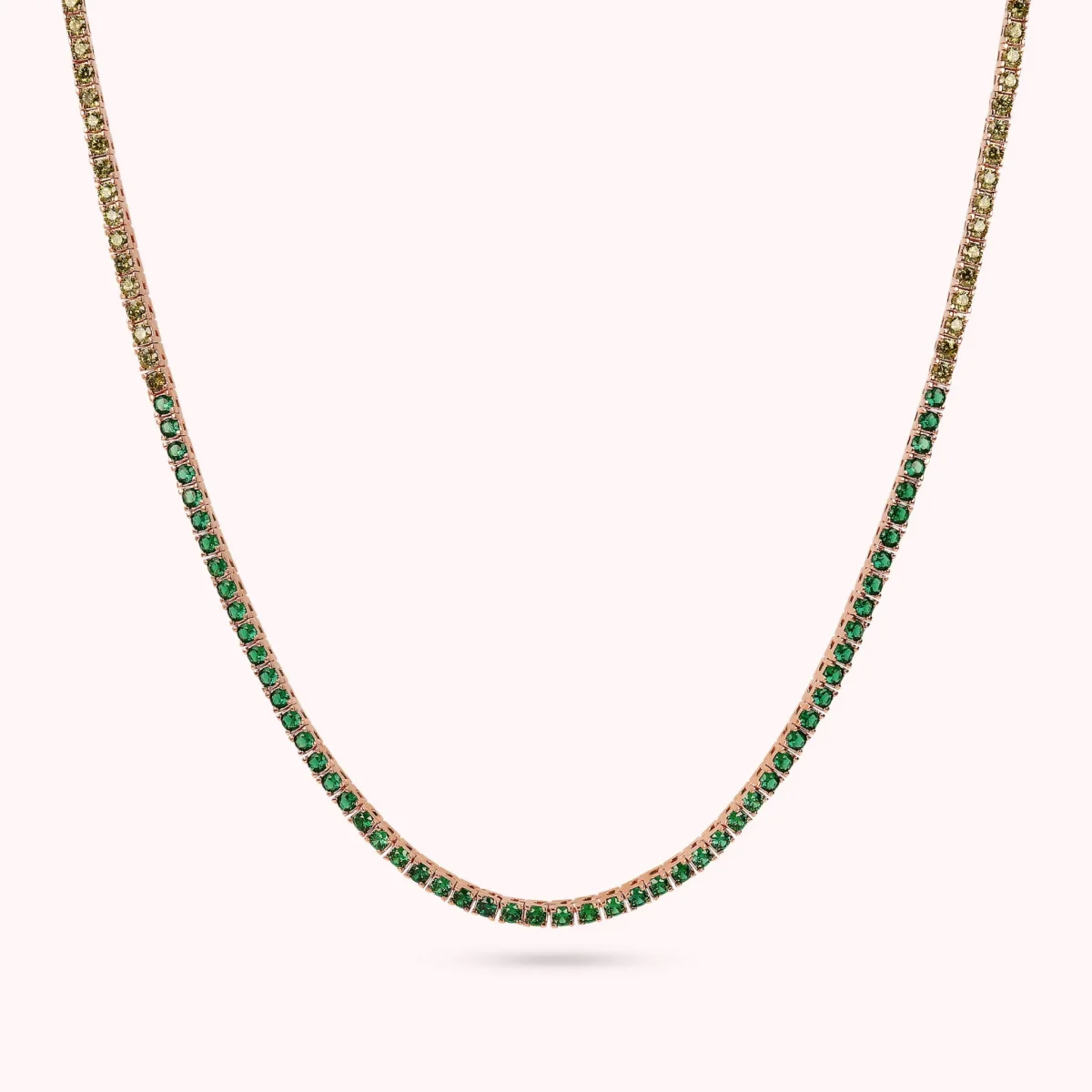 Collana tennis Bronzallure realizzata in lega Golden Rosé, placcata oro rosa 18kt, interamente impreziosita da cubic zirconia, dai colori gioiosi e raggianti, con una sfumatura creata attraverso tinte di pietre diverse per creare un effetto dégradé; chiusura a moschettone. Creazione elegante, dal design perfetto per far brillare il tuo look.