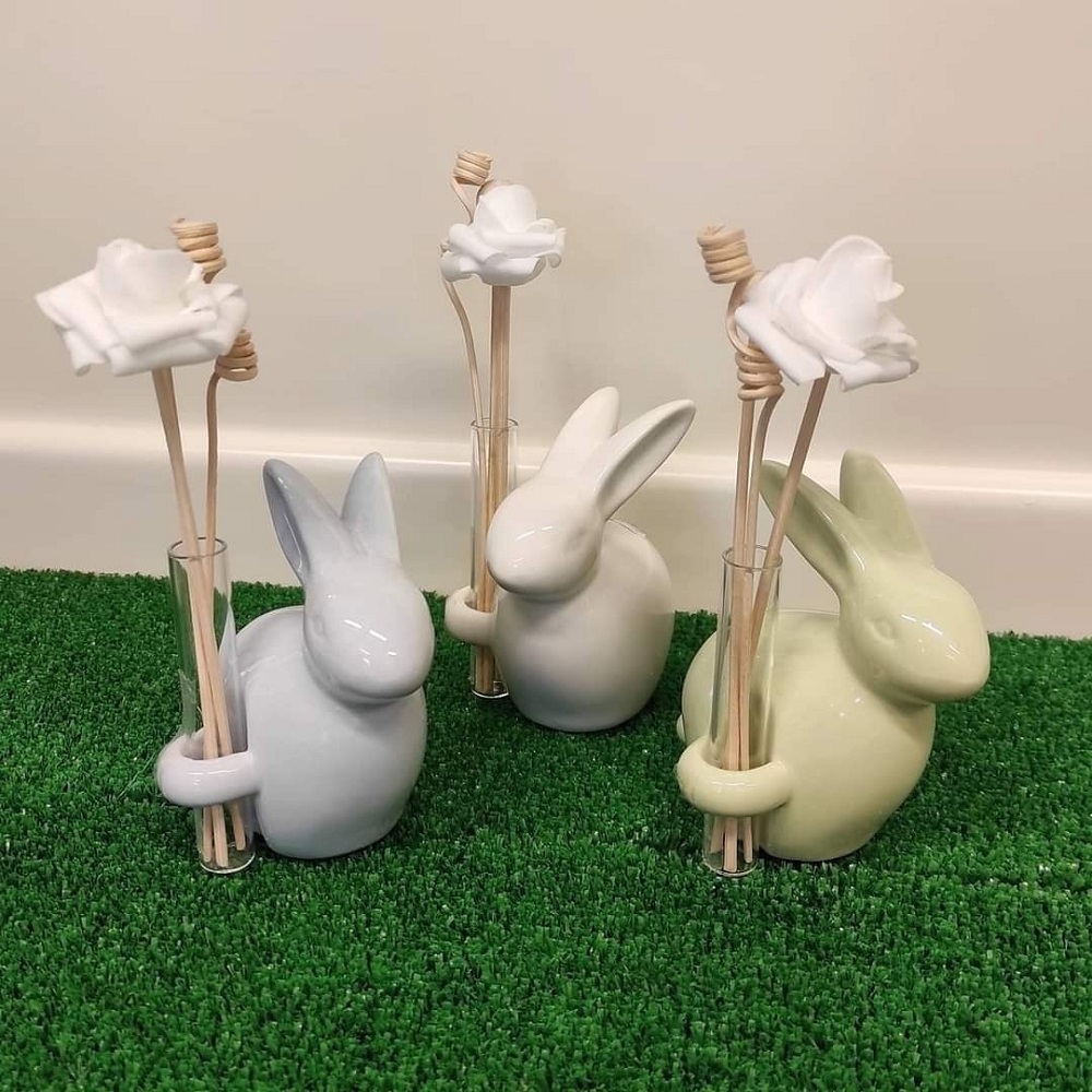 Profumatore coniglio in porcellana bianca o colorata con fialetta in vetro per profumazione. Bastoncini rosa e spirali inclusi, aggiungi la profumazione cliccando qui -> Profumazioni La Bottega dei Ricordi