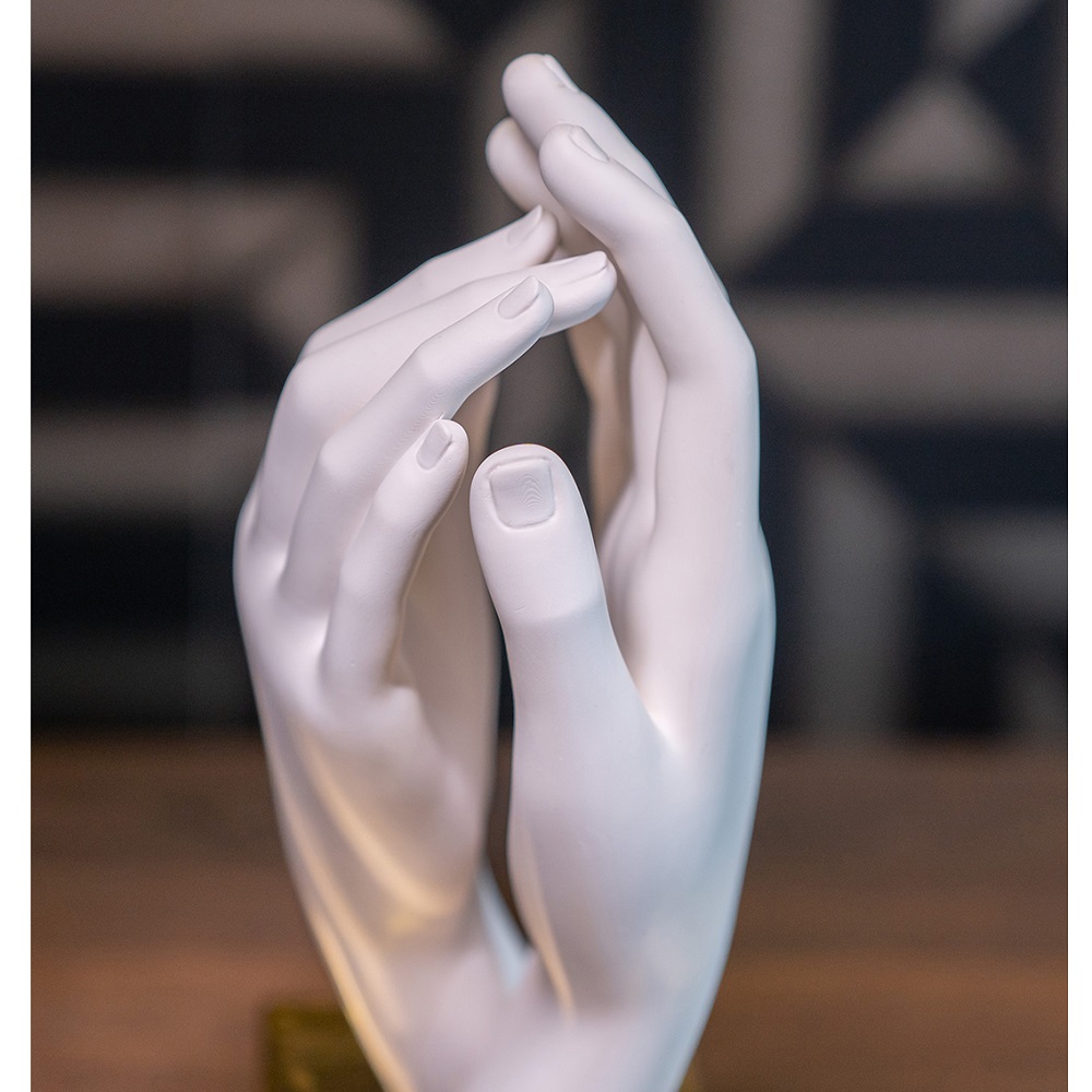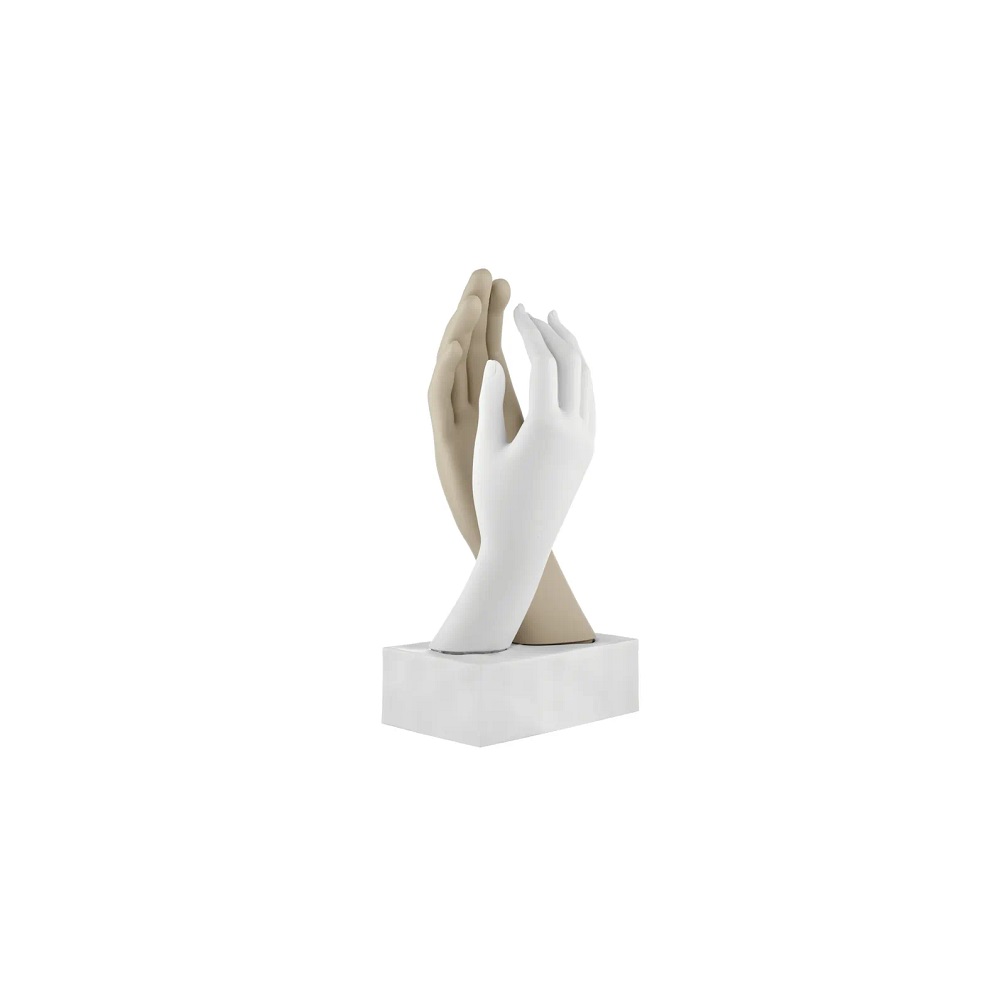 Scultura moderna in marmorino bianco raffigurante coppia di mani che si sfiorano su base in vari colori. Made in Italy