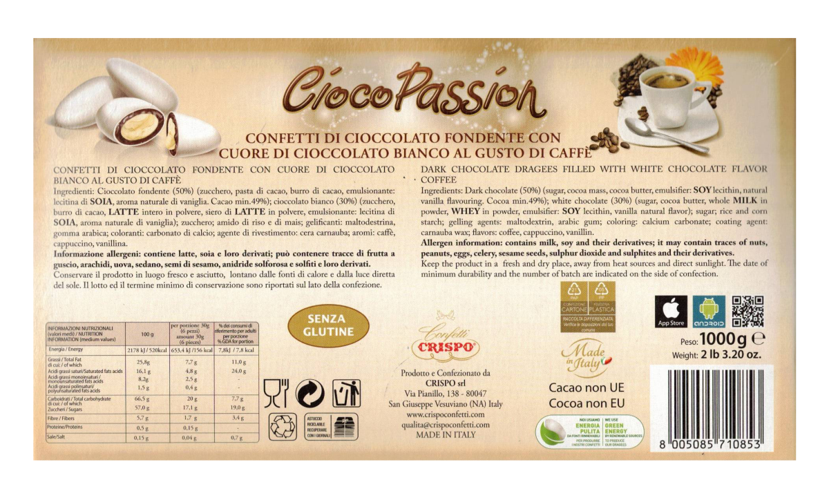 Scopri il delizioso mondo dei Ciocopassion Confetti di Cioccolato al Latte, un’esperienza di gusto che conquisterà il tuo palato! Questi confetti sono realizzati con un irresistibile strato di cioccolato al latte, che avvolge un cuore morbido di cioccolato bianco al gusto caffè. Ogni morso è una sinfonia di sapori, dove la dolcezza del cioccolato al latte si sposa perfettamente con la freschezza e l’intensità del caffè, creando un equilibrio perfetto tra i sapori. Ideali per ogni occasione, dai momenti di festa alle pause golose, questi confetti sono anche un regalo perfetto per chi ama il cioccolato di alta qualità.