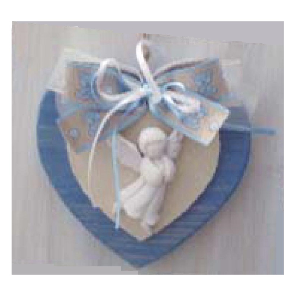 Cuore in legno azzurro con angelo e decorazioni con nastri. Da appendere. Made in Italy