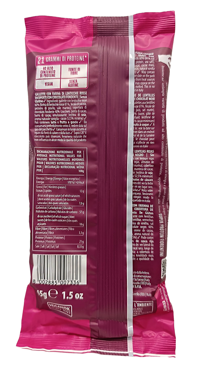 Ingredienti: gallette con lenticchie rosse 60% (farina di lenticchie rosse 81%, fecola di patata, proteine di pisello, sale marino), copertura di cioccolato fondente 40% (zucchero, pasta di cacao, burro di cacao, emulsionante: lecitina di soia, aroma naturale vaniglia – cacao 52,5% minimo)