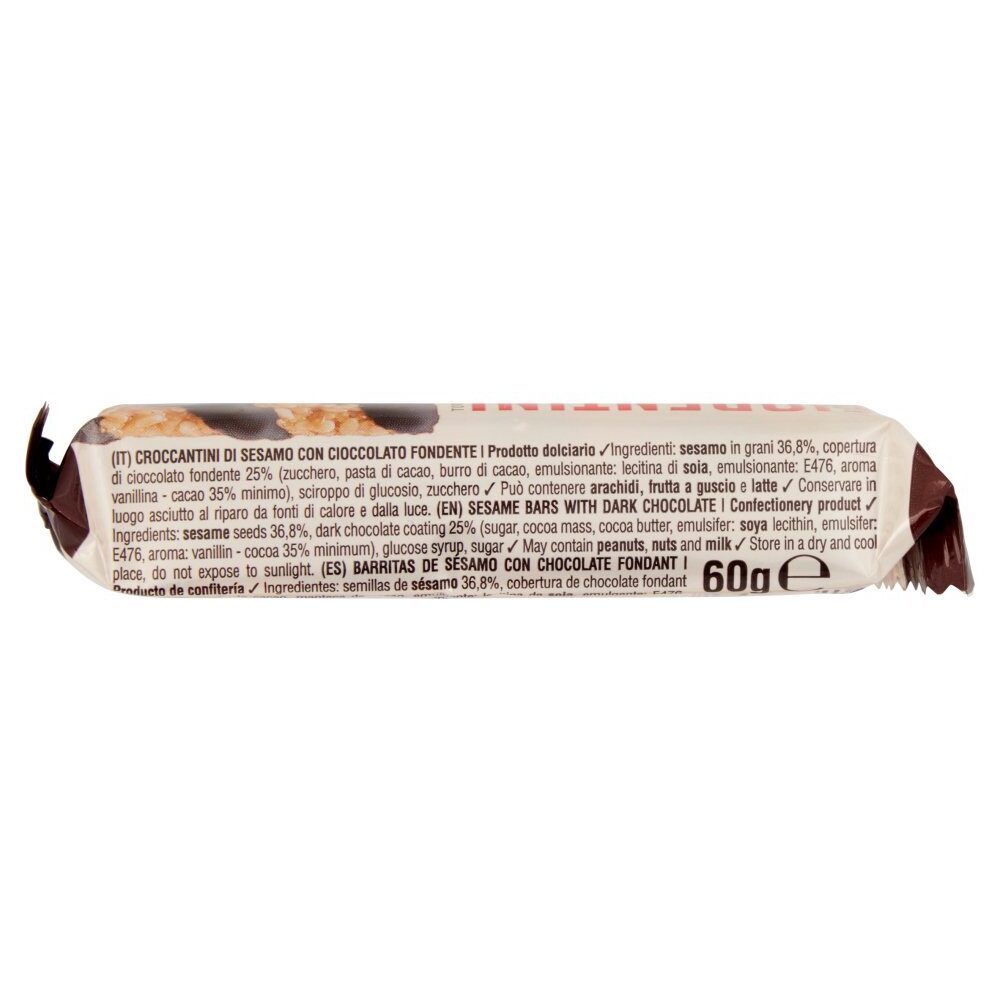 Sesamo in grani 36,8%, copertura di cioccolato fondente 25% (zucchero, pasta di cacao, burro di cacao, emulsionante: lecitina di soia, emulsionante: E476, aroma vanillina – cacao 35% minimo), sciroppo di glucosio, zucchero. Può contenere arachidi, frutta a guscio e latte