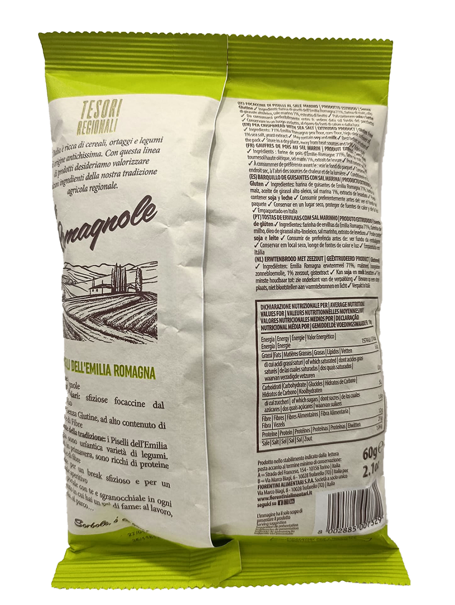 Scopri le deliziose Focaccine Le Romagnole, un autentico tesoro regionale dell’Emilia Romagna. Queste croccanti focaccine ai piselli sono preparate con ingredienti selezionati del territorio, incluso il pregiato sale marino locale. Perfette per uno spuntino leggero e gustoso, sono naturalmente senza glutine, ideali per chi segue una dieta celiaca o preferisce alternative senza glutine. La confezione da 60g è pratica e comoda, perfetta per essere portata sempre con sé. Il sapore delicato dei piselli dell’Emilia Romagna si unisce alla consistenza fragrante, creando uno snack irresistibile che rappresenta l’eccellenza della tradizione gastronomica italiana.