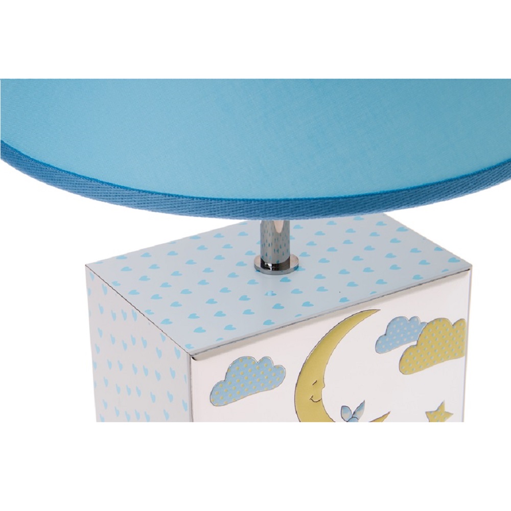 Lampada in legno laccato bianco con decoro cuori azzurri o rosa. Placca in argento bilaminato. Paralume in cotone color azzurro o rosa