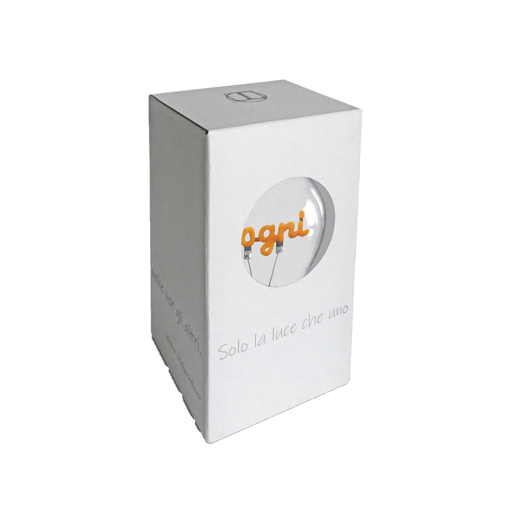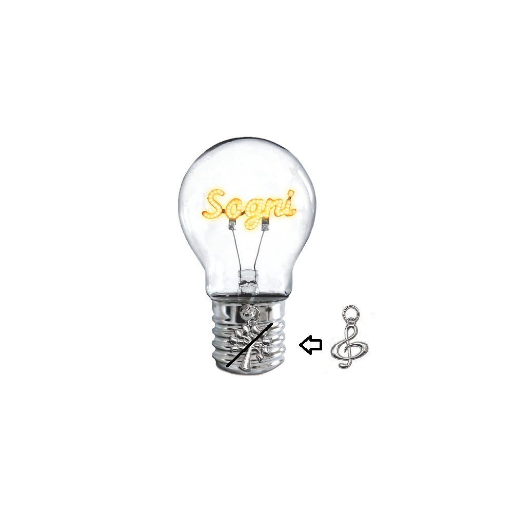 Lampadina ornamentale in vetro trasparente con scritta led “Sogni”. Base in metallo con ciondolo chiave di violino in argento. Cavo di ricarica USB incluso. Scatola bianca con scritta “Solo la luce che uno accende a se stesso risplende in seguito anche per gli altri.”
