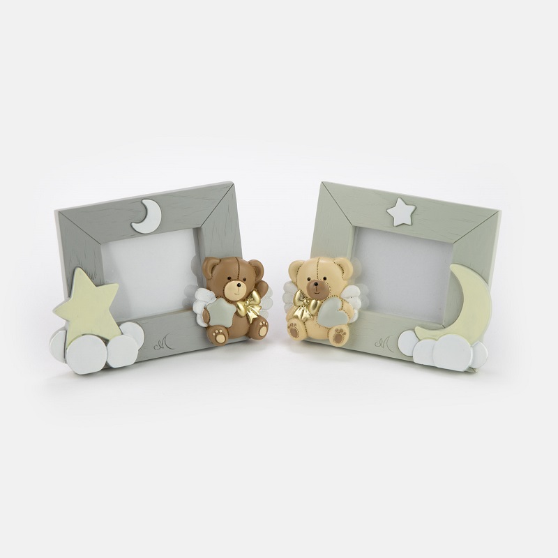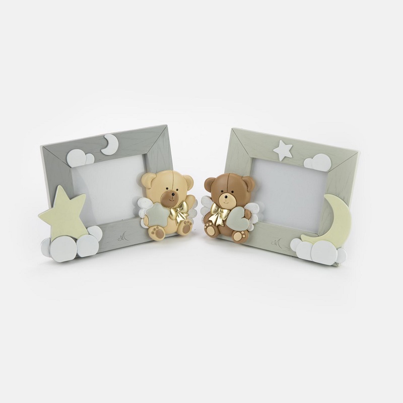 Linea composta da magnete orsetto, orsetto piccolo, orsetto medio, orsetto grande, portafoto piccolo per fotografia 8 x 6 cm orizzontale, portafoto grande per fotografia 13 x 9 cm orizzontale, salvadanaio orsetto, salvadanaio orso gigante, set 3 scatole tonde con 24 scatole e kit decorazioni. Modelli assortiti.