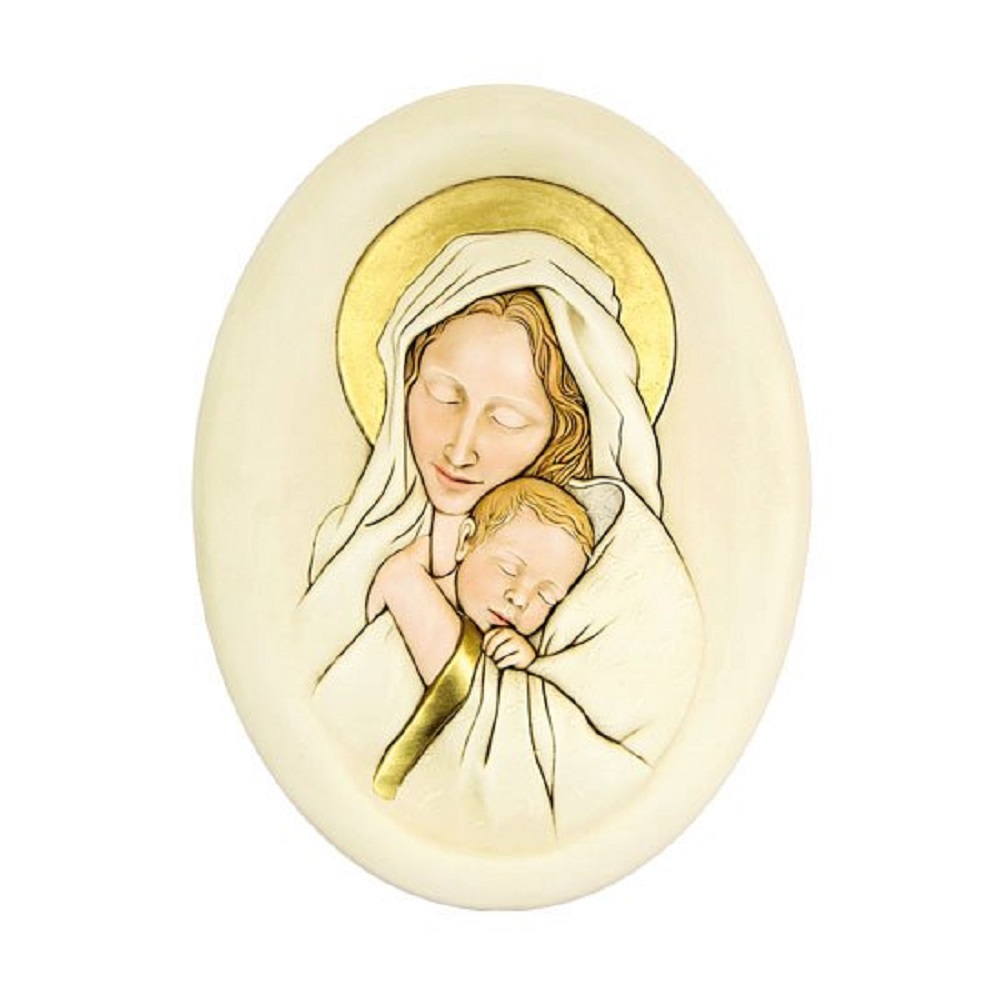 Maternità ovale decorata a mano con colori e vernici atossiche. Da appendere