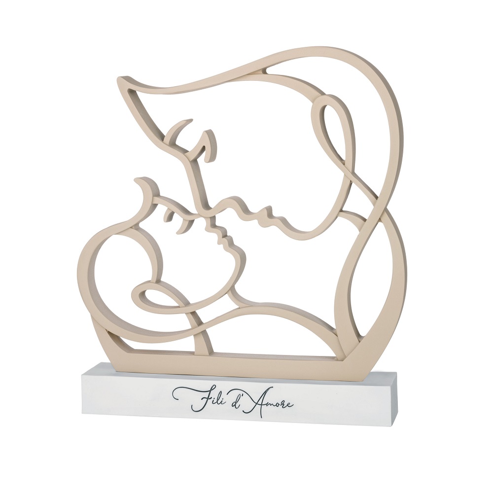 Scultura moderna raffigurante maternità stilizzata nocciola su base bianca. Made in Italy