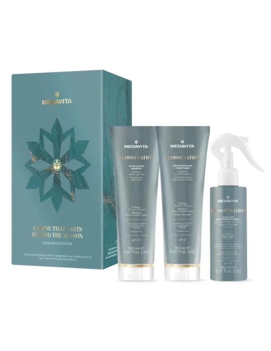Medavita Glossination Glaze e Glow è il trattamento di laminazione professionale che dona un effetto specchio immediato, disciplina il crespo e leviga la fibra capillare, valorizzando la brillantezza del colore e la morbidezza al tatto. Il rituale lavora in due step complementari: