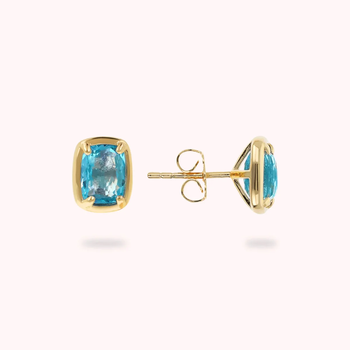 Orecchini a lobo Bronzallure realizzati in lega Golden Rosé, placcata Oro giallo 18kt, con due pietre prisma gem dal taglio a baguette (8×6 mm). Chiusura a perno e farfalla.