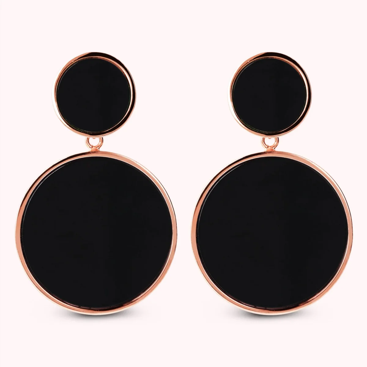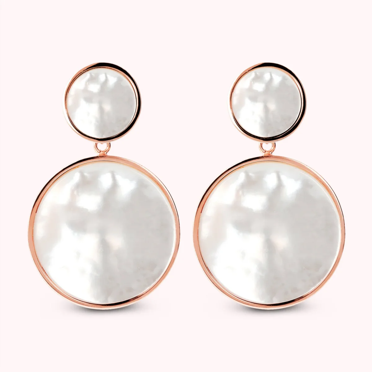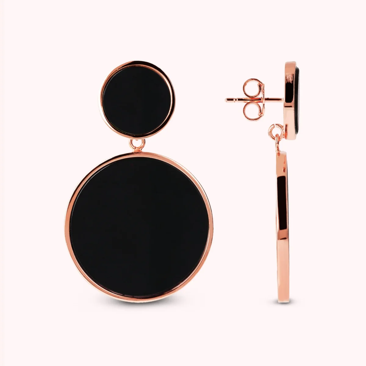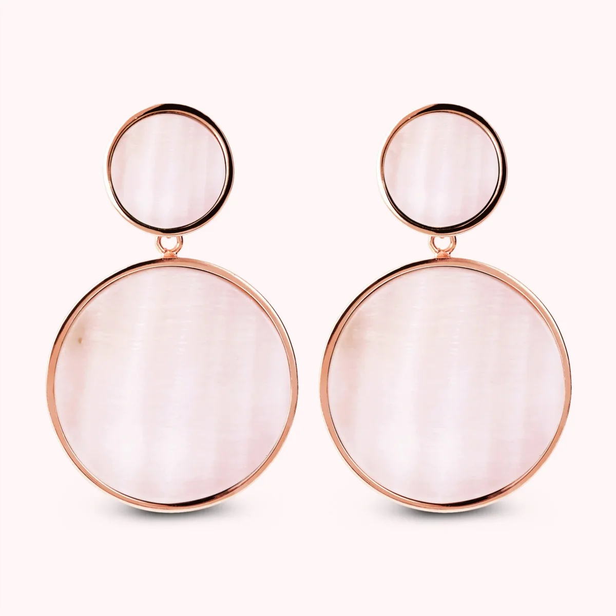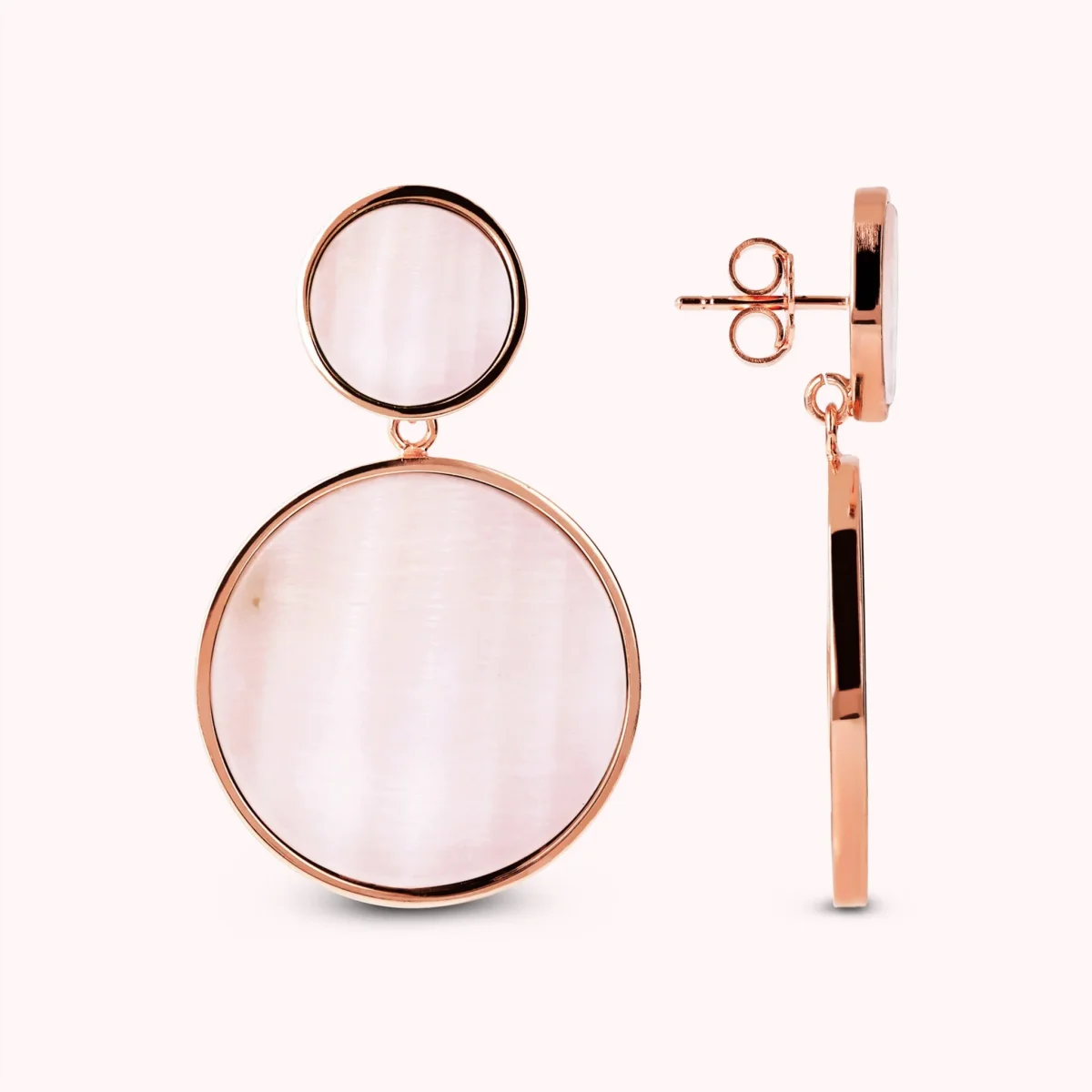Orecchini pendenti Bronzallure realizzati in lega Golden Rosé, placcati oro rosa 18kt a doppio disco con pietra naturale: uno piccolo (12 mm) e uno grande (25 mm). Chiusura a perno e farfalla.