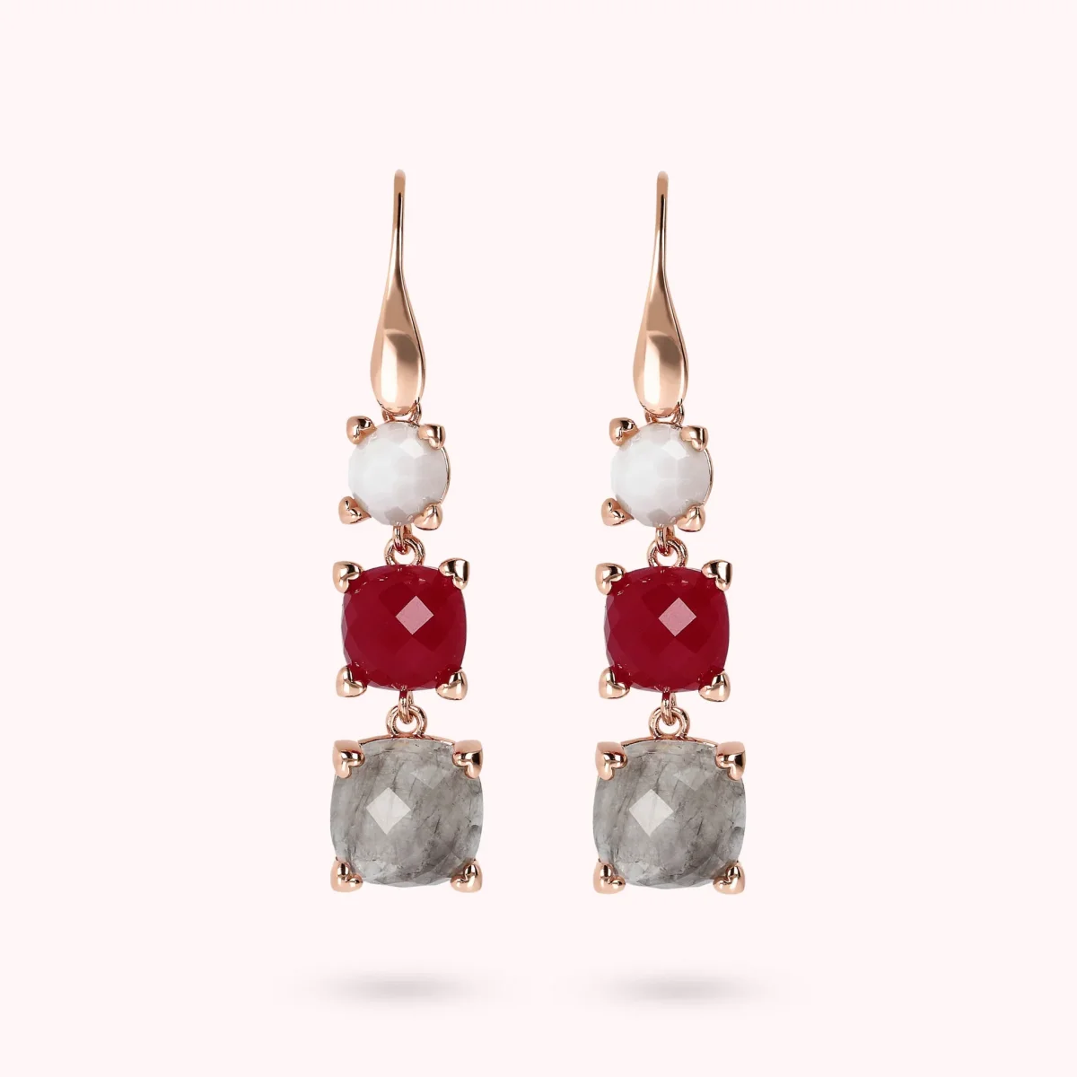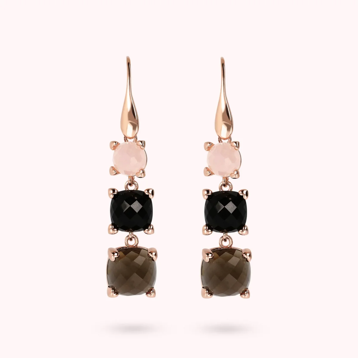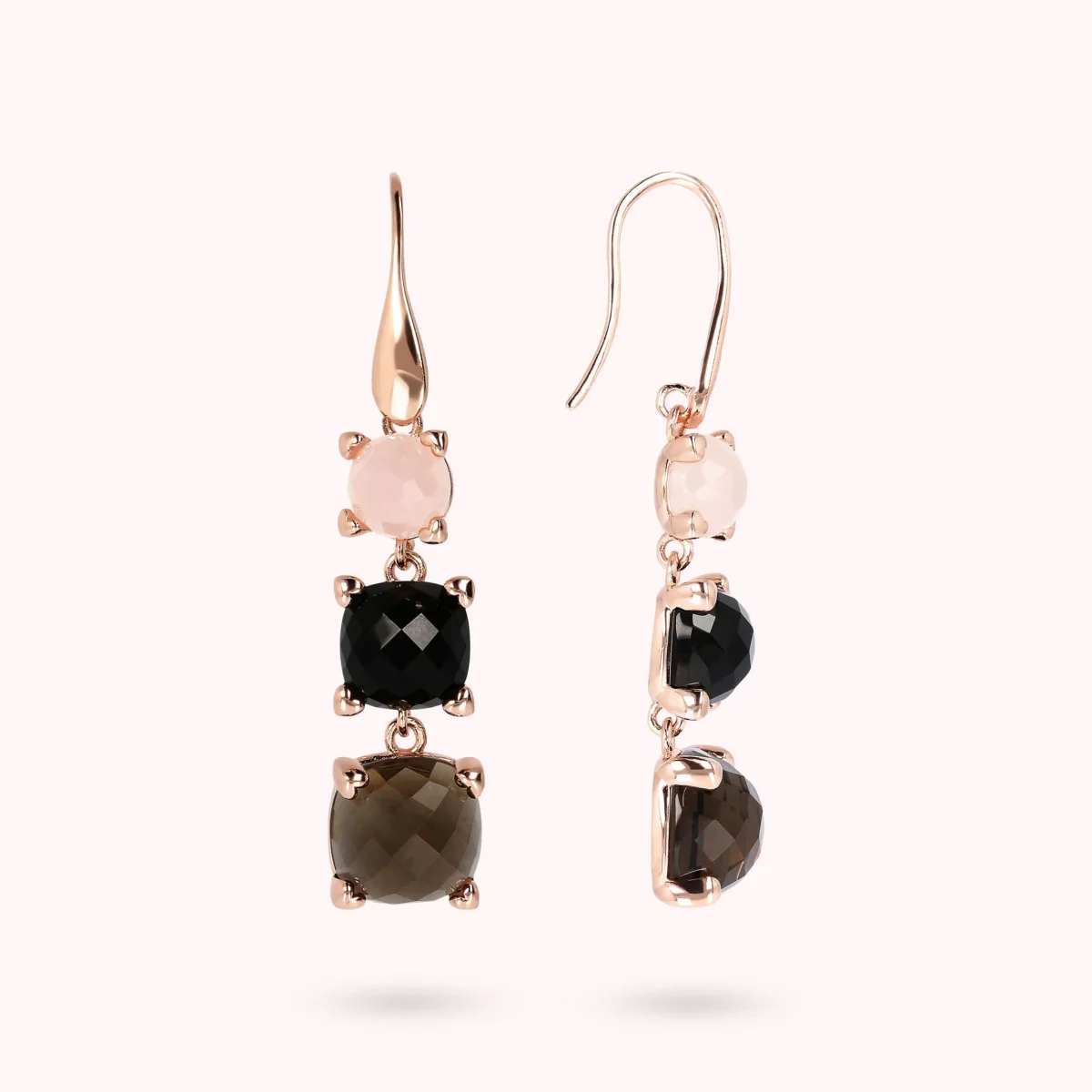 Orecchini pendenti Bronzallure realizzati in lega Golden Rosé, placcati oro rosa 18kt, composta da una fila di tre pietre naturali sfaccettate graduate (8/10/12 mm) posizionate su castoni a cuore. Lunghezza di 4.6 cm e chiusura ad amo.