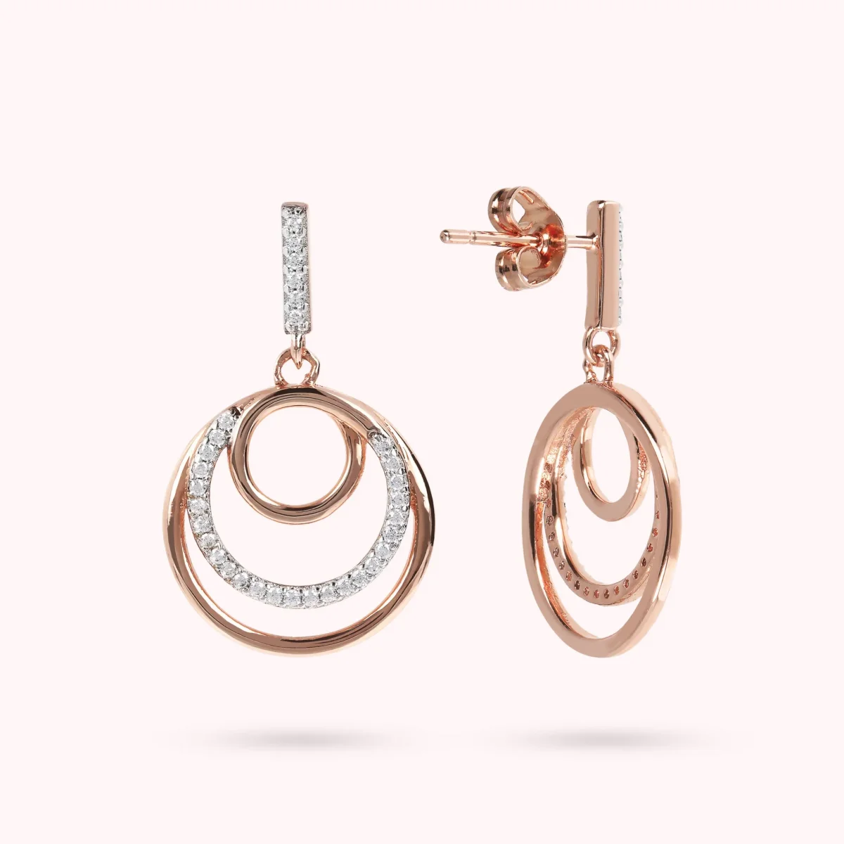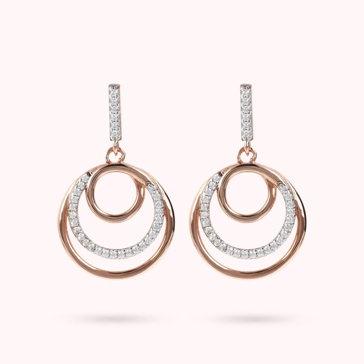 Orecchini pendenti Bronzallure realizzati in lega Golden Rosé, placcati oro rosa 18kt, composti da una contro maglia in pavé di cubic zirconia luminosi e da un triplo cerchio graduato come ciondolo, il cerchio intermedio anch’esso in cubic zirconia luminosa; chiusura perno e farfalla; lunghezza di 2.5 cm. Creazione elegante e perfetta per far brillare il tuo look.