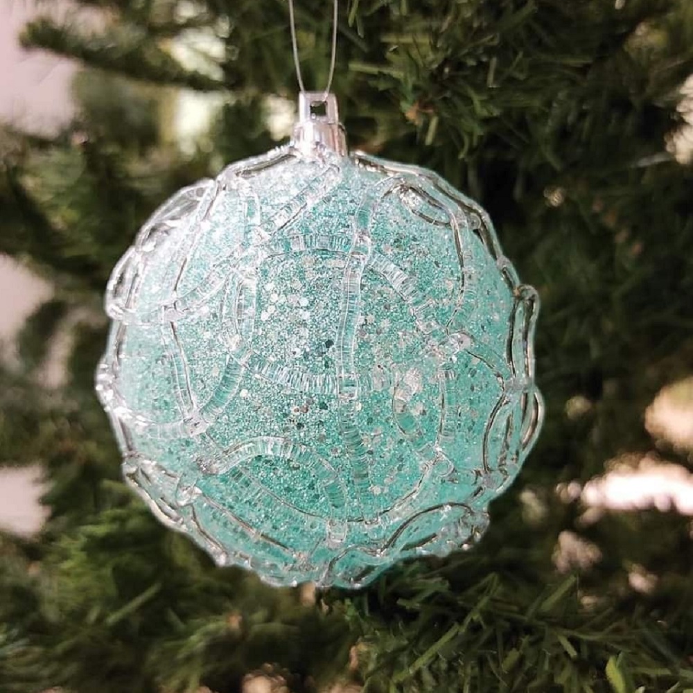 Pallina infrangibile color verde acqua con glitter argento e decorazione fili. Da appendere