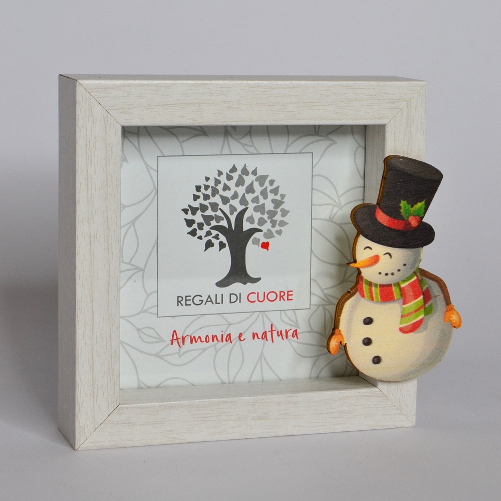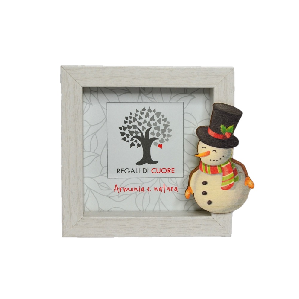 Portafoto in legno sbiancato con applicazione pupazzo di neve colorato per fotografia da 10 x 10 cm. Da appoggio o da appendere