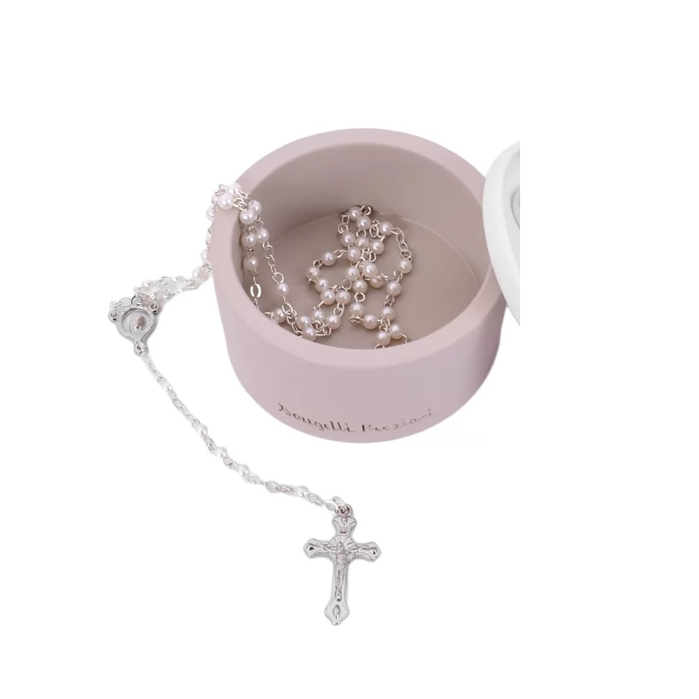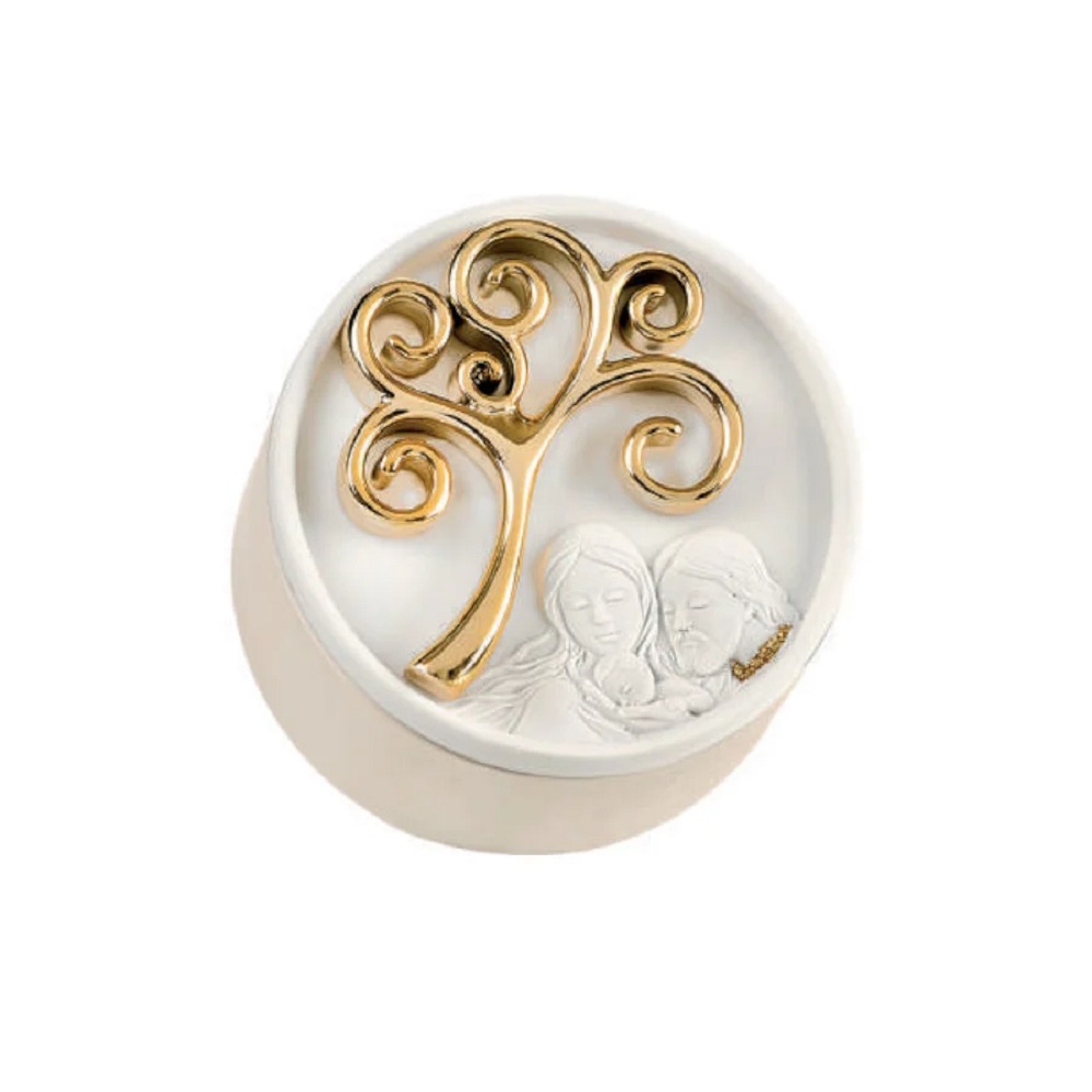 Scatola in resina color nocciola con coperchio in marmorino bianco con decoro famiglia dettaglio glitter oro e albero della vita color oro lucido. Rosario incluso. Made in Italy