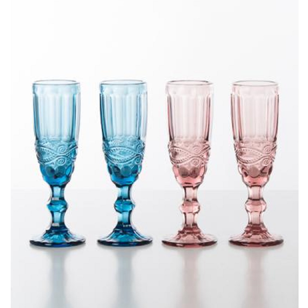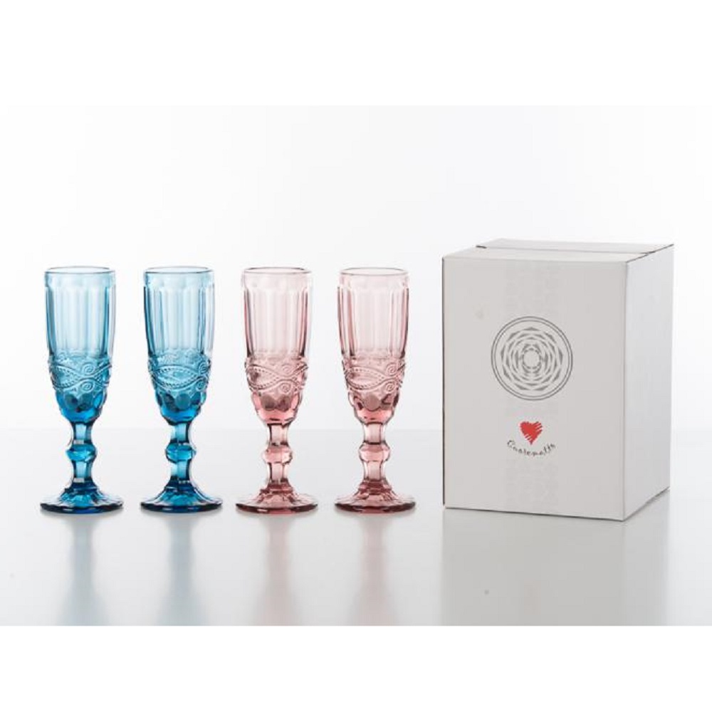Set da 4 flute in vetro decorato e colorato (blu e rosa)