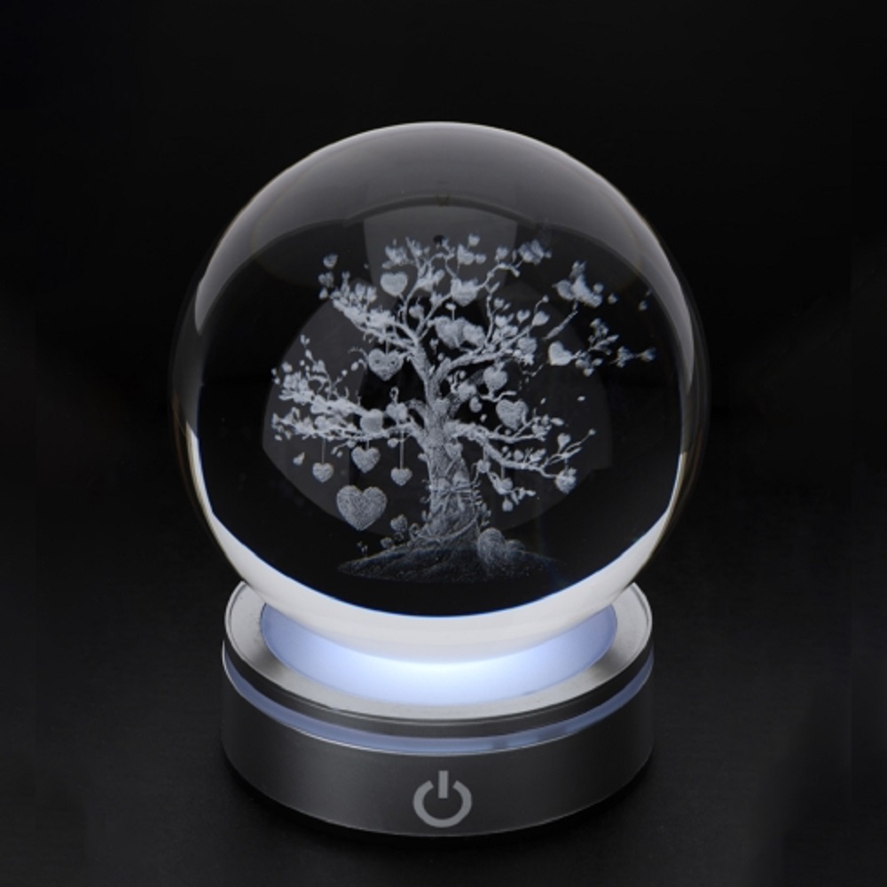 Sfera luminosa multicolore in vetro con decoro albero della vita con cuori 3D all’interno su base in color argento. Accensione touch e funzionamento con batterie (non incluse) o cavo USB (incluso)