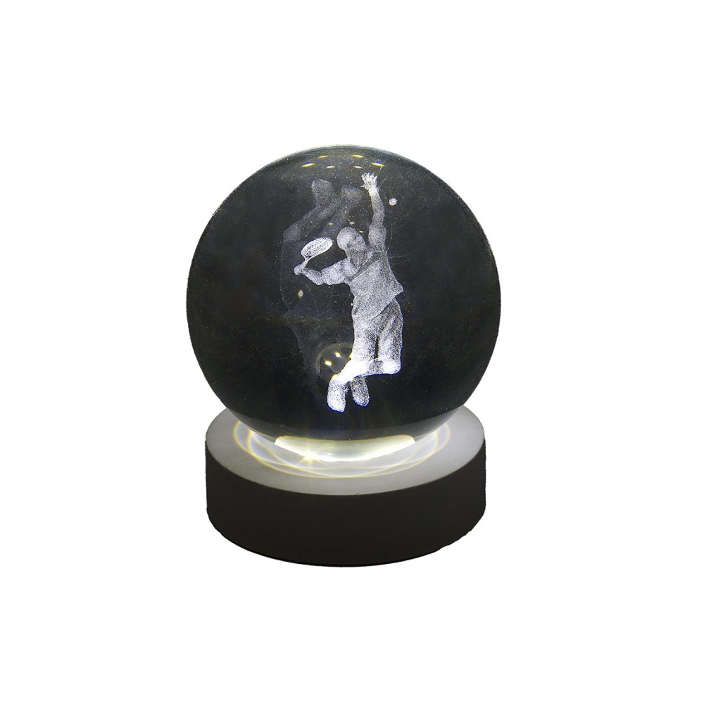 Sfera luminosa in vetro con decoro tennista 3D all’interno su base in legno bianco. Funzionamento con cavo USB (incluso)