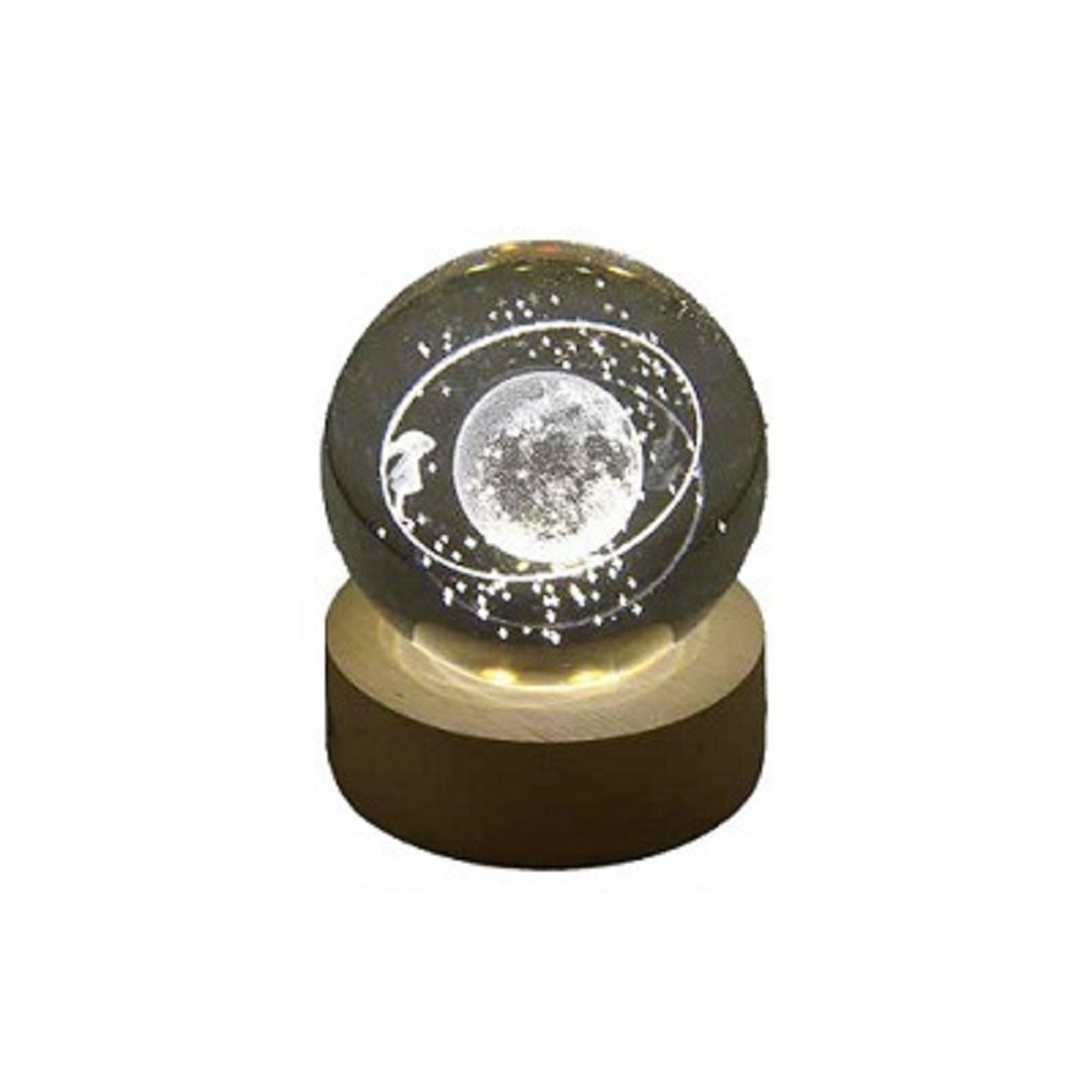 Sfera luminosa in vetro con decoro bimba su mondo con stelle 3D all’interno su base in legno grezzo. Funzionamento con cavo USB (incluso)
