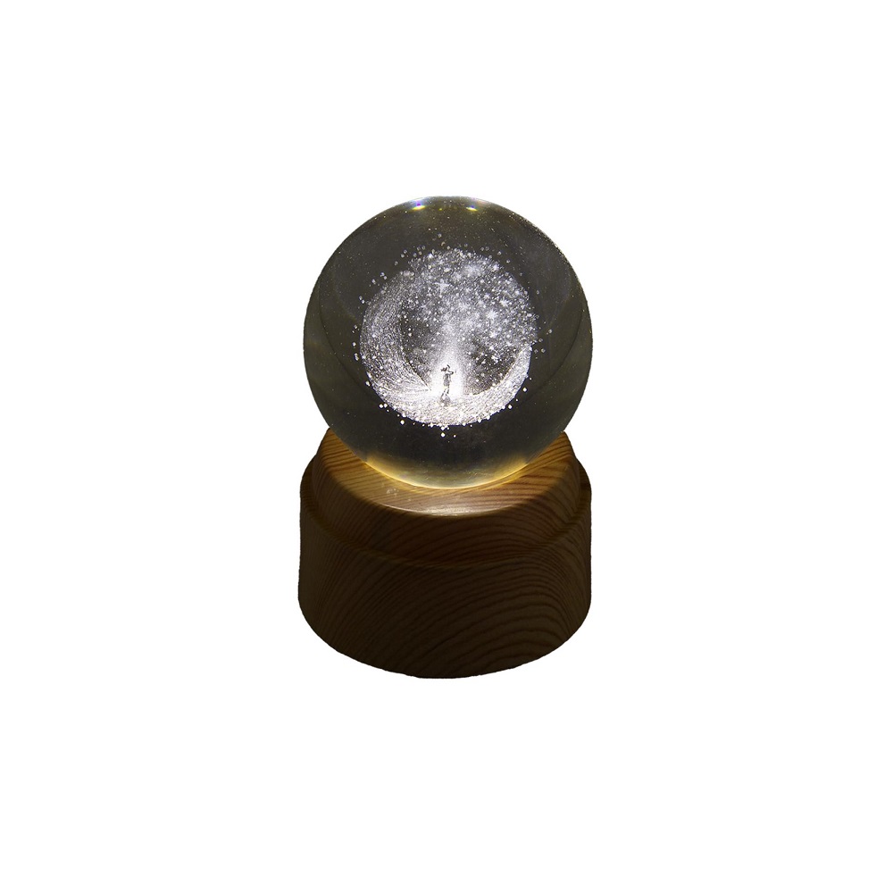 Sfera luminosa in vetro con decoro bimbo/a tra le stelle 3D all’interno su base rotativa in legno grezzo. Funzionamento con cavo USB (incluso)