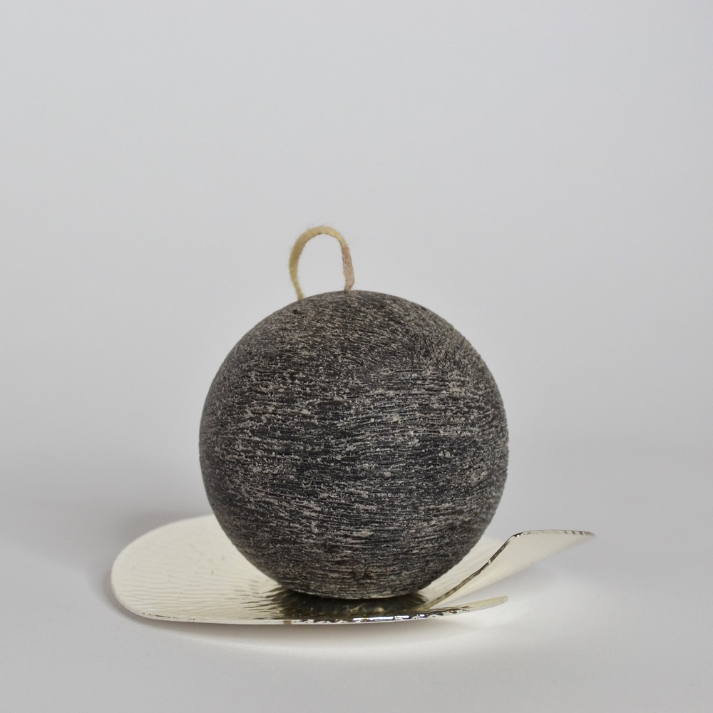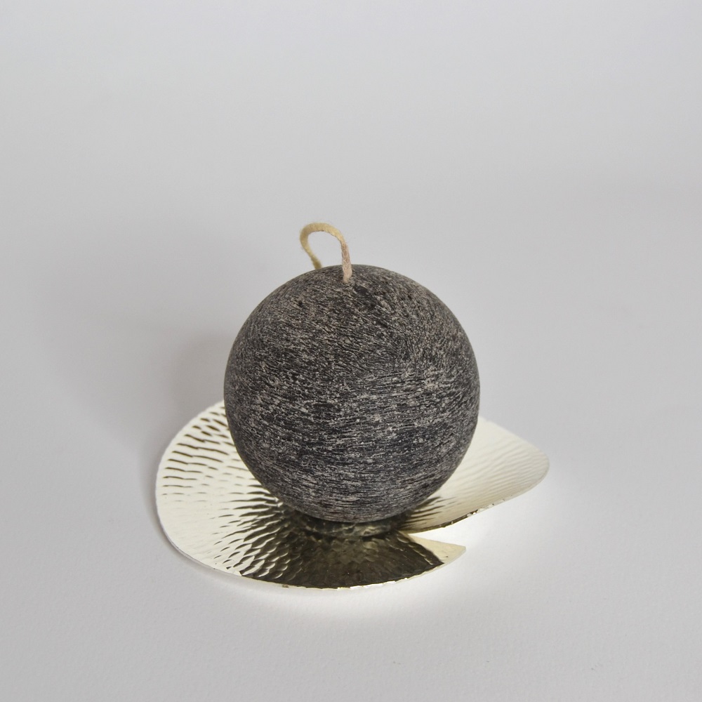 Candela profumata a forma di sfera nera su piattino in argento decorato