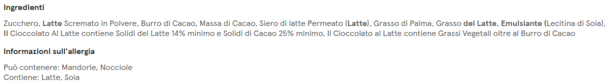 Zucchero, latte scremato in polvere, burro di cacao, massa di cacao, siero di latte permeato (latte), grasso di palma, grasso del latte, emulsionante (lecitina di soia). Il cioccolato al latte contiene solidi del latte 14% minimo e solidi di cacao 25% minimo. Il cioccolato al latte contiene grassi vegetali oltre al burro di cacao.