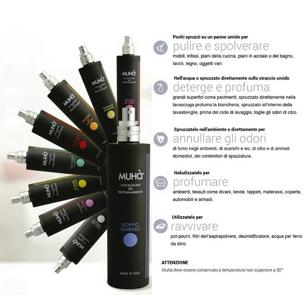 Profumo spray multiuso a base d’acqua. Pochi spruzzi su un panno umido per pulire e spolverare (mobili, infissi, piani della cucina o del bagno, piani in acciaio, tavoli, legno ed oggetti vari), nell’acqua o spruzzato direttamente sullo straccio umido per detergere e profumare grandi superfici (come pavimenti), spruzzato direttamente nella lavatrice o nella lavastoviglie prima del lavaggio per togliere gli odori forti oppure spruzzato direttamente nell’ambiente per togliere gli odori di fumo, scarichi e wc, animali domestici e spazzatura. Utile anche per ravvivare pot-pourri, filtri dell’aspirapolvere o di deumidificatori