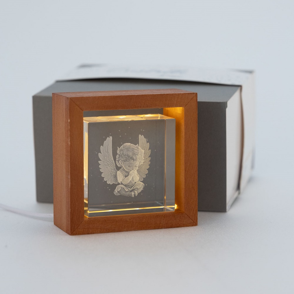 Parallelepipedo in vetro trasparente con decoro angelo 3D all’interno in teca in legno. Funzionamento con cavo USB (incluso)