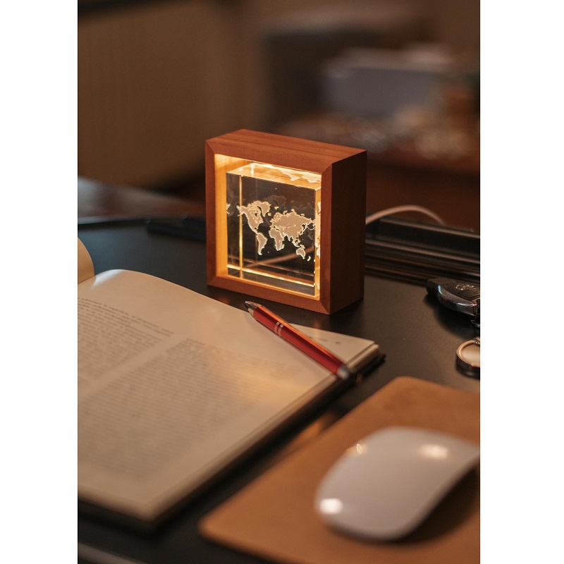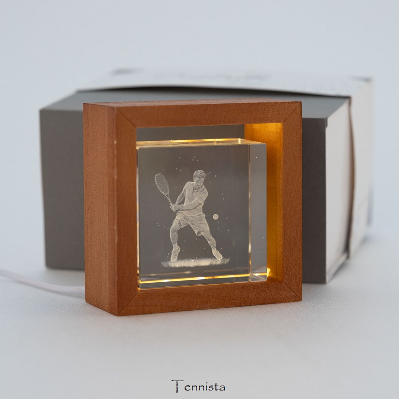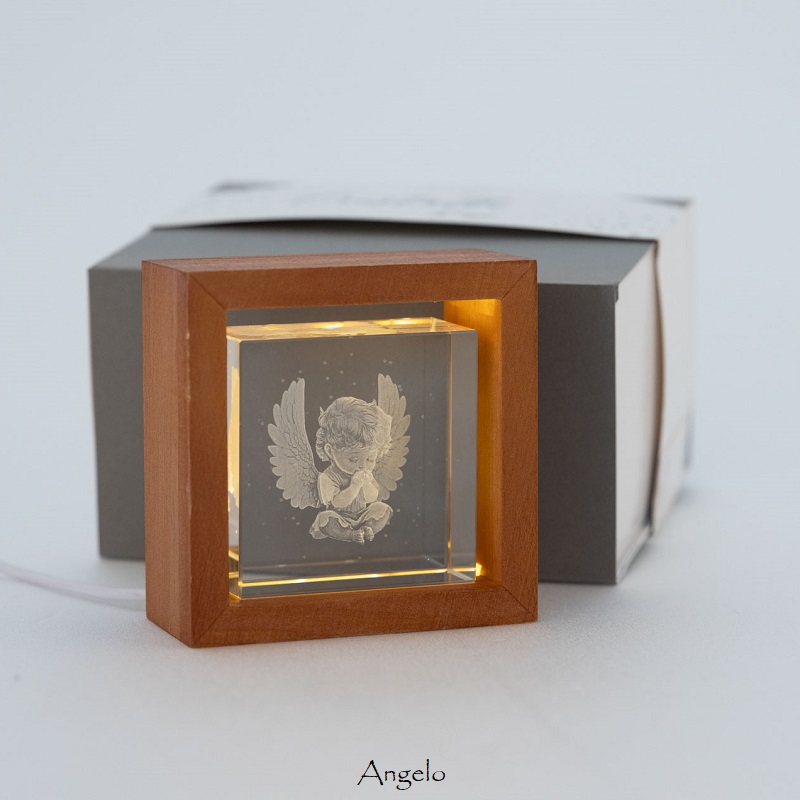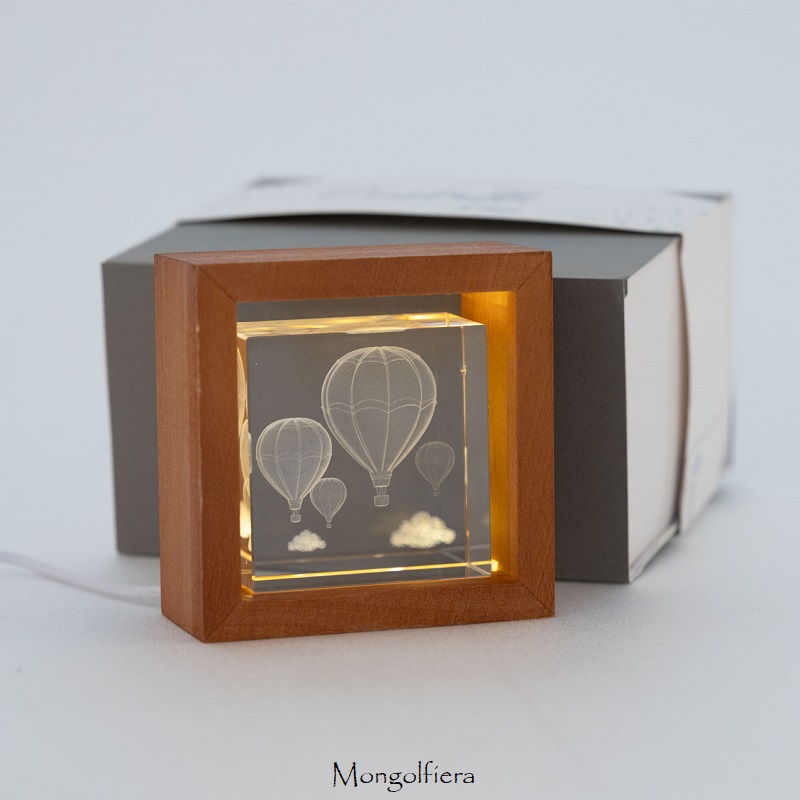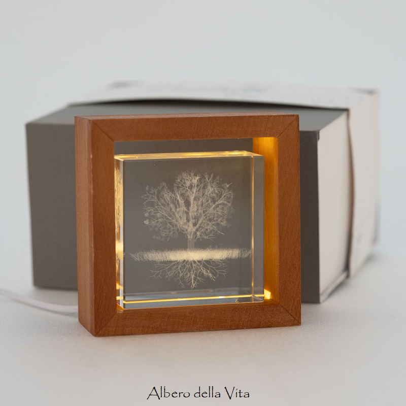 Parallelepipedi in vetro trasparente con decoro angelo/ballerina/calciatore//mongolfiera/mondo/tennista/albero della vita 3D all’interno in teca in legno. Funzionamento con cavo USB (incluso).