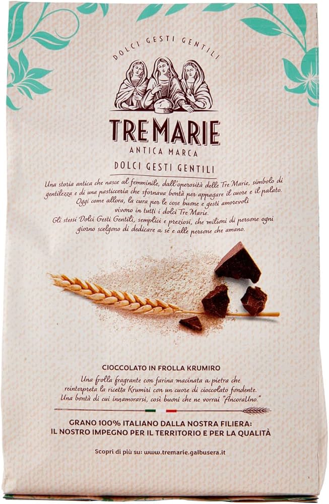 Scopri i deliziosi biscotti Tre Marie Antica Marca, un’autentica prelibatezza italiana realizzata con grano 100% nazionale. Questi squisiti krumiri di frolla sono arricchiti con un goloso ripieno al cioccolato fondente che si scioglie in bocca ad ogni morso. La confezione da 315g contiene questi biscotti dalla caratteristica forma rigata, perfetti per una pausa dolce o per accompagnare il tè del pomeriggio. La ricetta tradizionale si unisce alla qualità superiore degli ingredienti per creare un biscotto dal gusto unico e avvolgente.