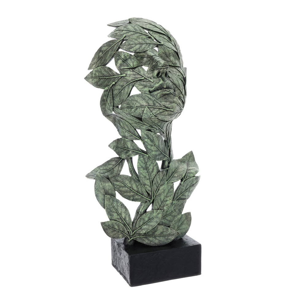 Scultura moderna raffigurante viso composto da foglie verdi su base color nero
